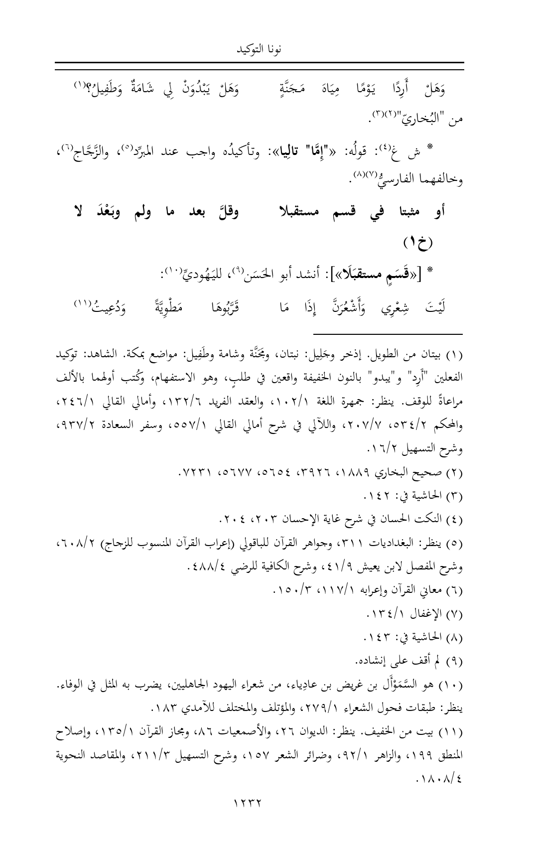 (¬١) بيتان من الطويل. إذخر وجَلِيل: نبتان، ومَجَنَّة وشامة وطَفِيل: مواضع بمكة. الشاهد: توكيد الفعلين "أَرِد" و"يبدو" بالنون الخفيفة واقعين في طلبٍ، وهو الاستفهام، وكُتب أولهما بالألف مراعاةً للوقف. ينظر: جمهرة اللغة ١/ ١٠٢، والعقد الفريد ٦/ ١٣٢، وأمالي القالي ١/ ٢٤٦، والمحكم ٢/ ٥٣٤، ٧/ ٢٠٧، واللآلي في شرح أمالي القالي ١/ ٥٥٧، وسفر السعادة ٢/ ٩٣٧، وشرح التسهيل ٢/ ١٦.