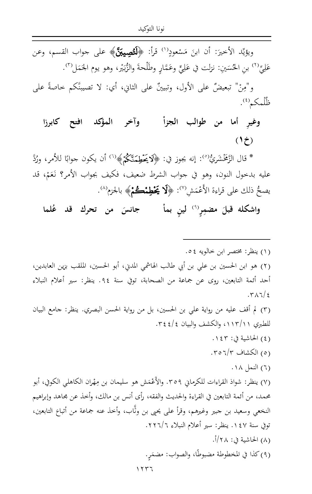 (¬٧) ينظر: شواذ القراءات للكرماني ٣٥٩. والأَعْمَش هو سليمان بن مِهْران الكاهلي الكوفي، أبو محمد، من أئمة التابعين في القراءة والحديث والفقه، رأى أنس بن مالك، وأخذ عن مجاهد وإبراهيم النخعي وسعيد بن جبير وغيرهم، وقرأ على يحيى بن وثَّاب، وأخذ عنه جماعة من أتباع التابعين، توفي سنة ١٤٧. ينظر: سير أعلام النبلاء ٦/ ٢٢٦.