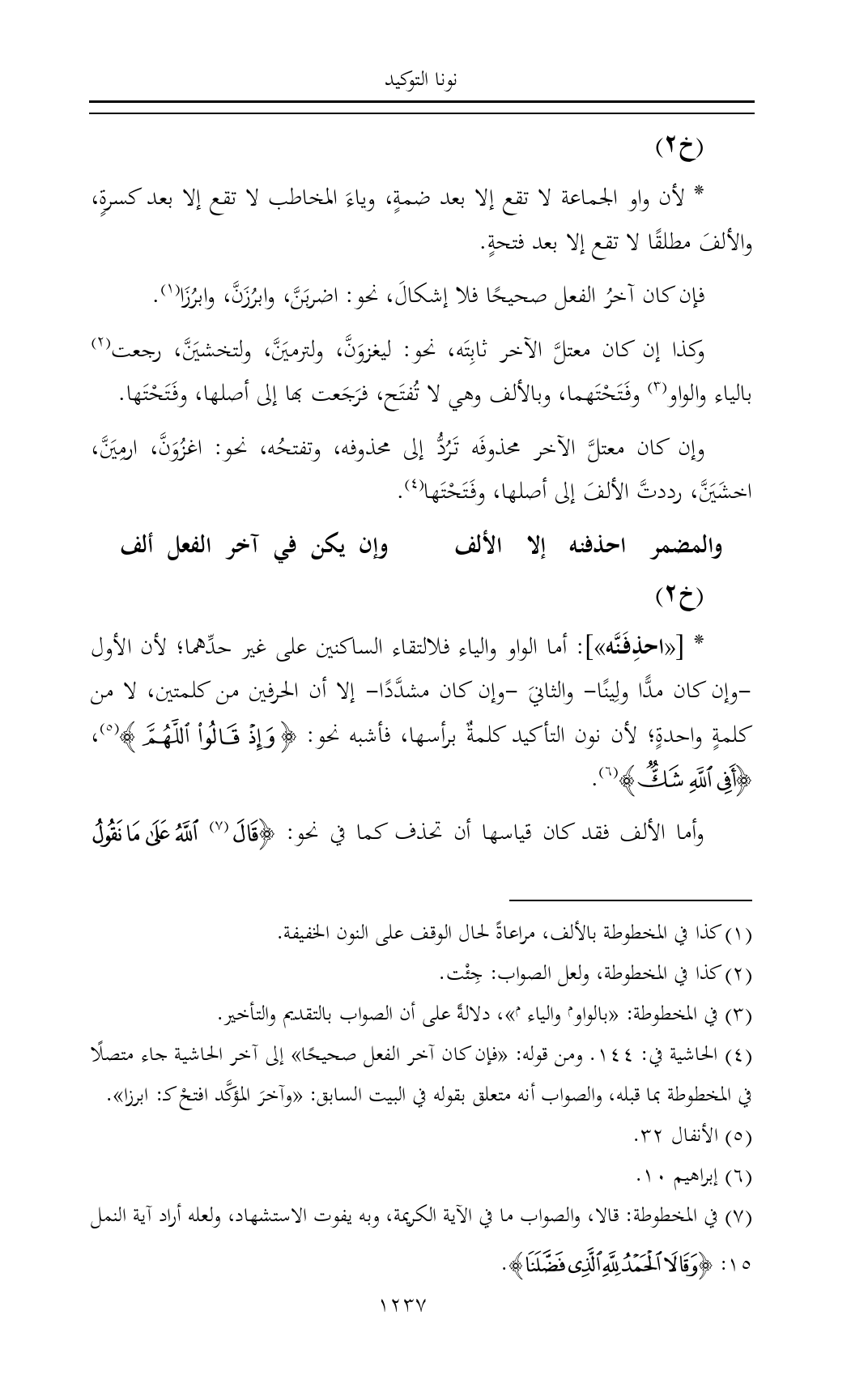 (¬٤) الحاشية في: ١٤٤. ومن قوله: «فإن كان آخر الفعل صحيحًا» إلى آخر الحاشية جاء متصلًا في المخطوطة بما قبله، والصواب أنه متعلق بقوله في البيت السابق: «وآخرَ المؤكَّد افتحْ كـ: ابرزا».