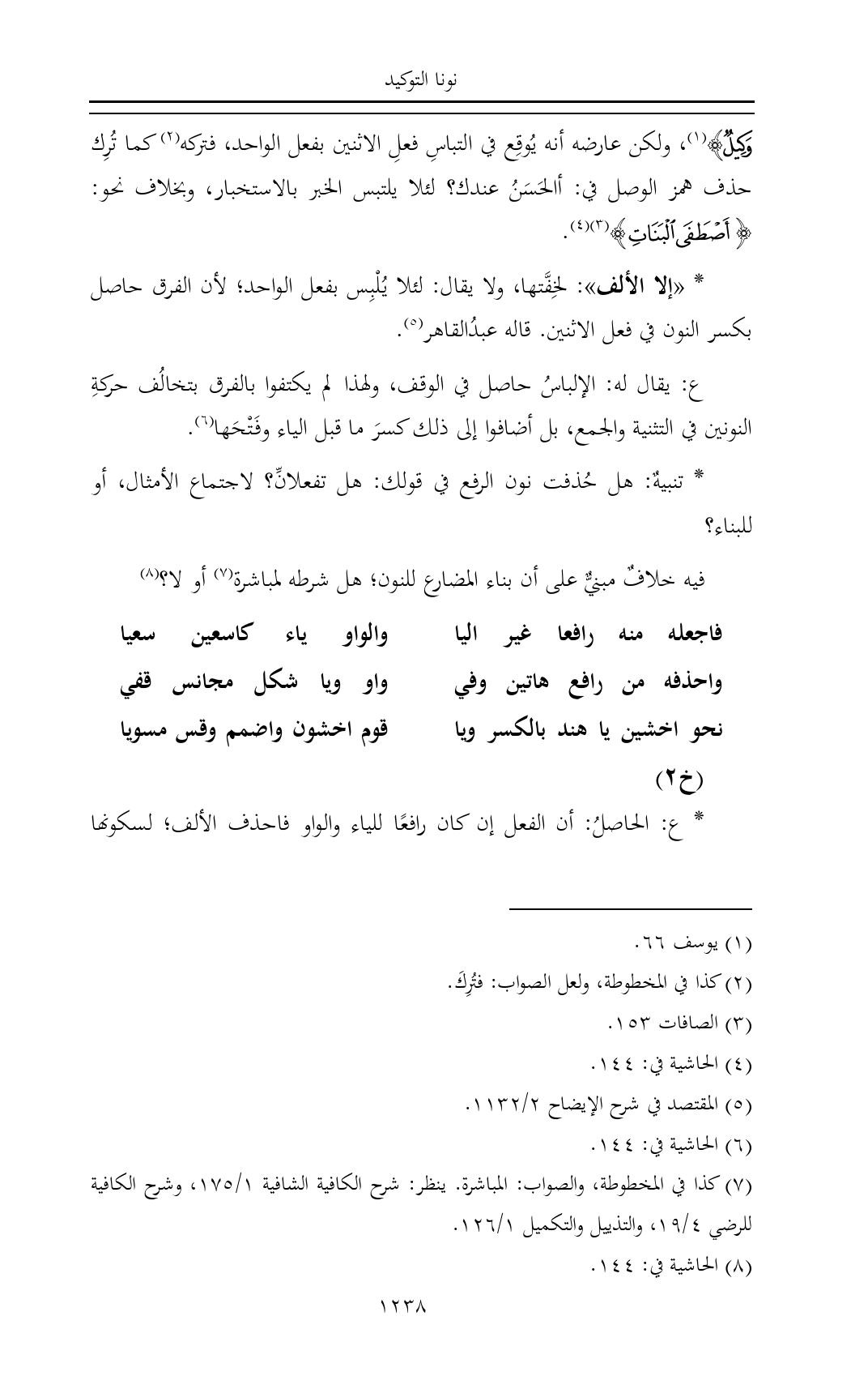 ع: يقال له: الإلباسُ حاصل في الوقف، ولهذا لم يكتفوا بالفرق بتخالُف حركةِ النونين في التثنية والجمع، بل أضافوا إلى ذلك كسرَ ما قبل الياء وفَتْحَها (¬٦).