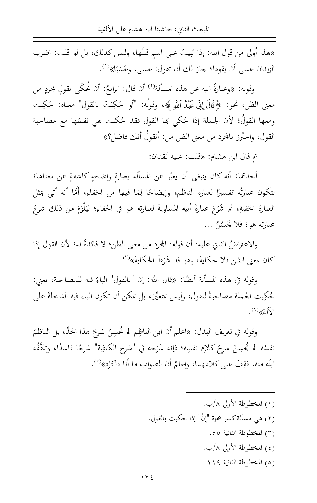 وقوله: «وعبارةُ ابنِه عن هذه المسألة (¬٢) أن قال: الرابعُ: أن تُحكَى بقولٍ مجردٍ من معنى الظن، نحو: {قَالَ إِنِّي عَبْدُ اللَّهِ}، وقولُه: "أو حُكِيَتْ بالقول" معناه: حُكِيت ومعها القولُ؛ لأن الجملة إذا حُكي بها القول فقد حُكيت هي نفسُها مع مصاحبة القول، واحتُرز بالمجرد من معنى الظن من: أتقولُ أنك فاضل؟»