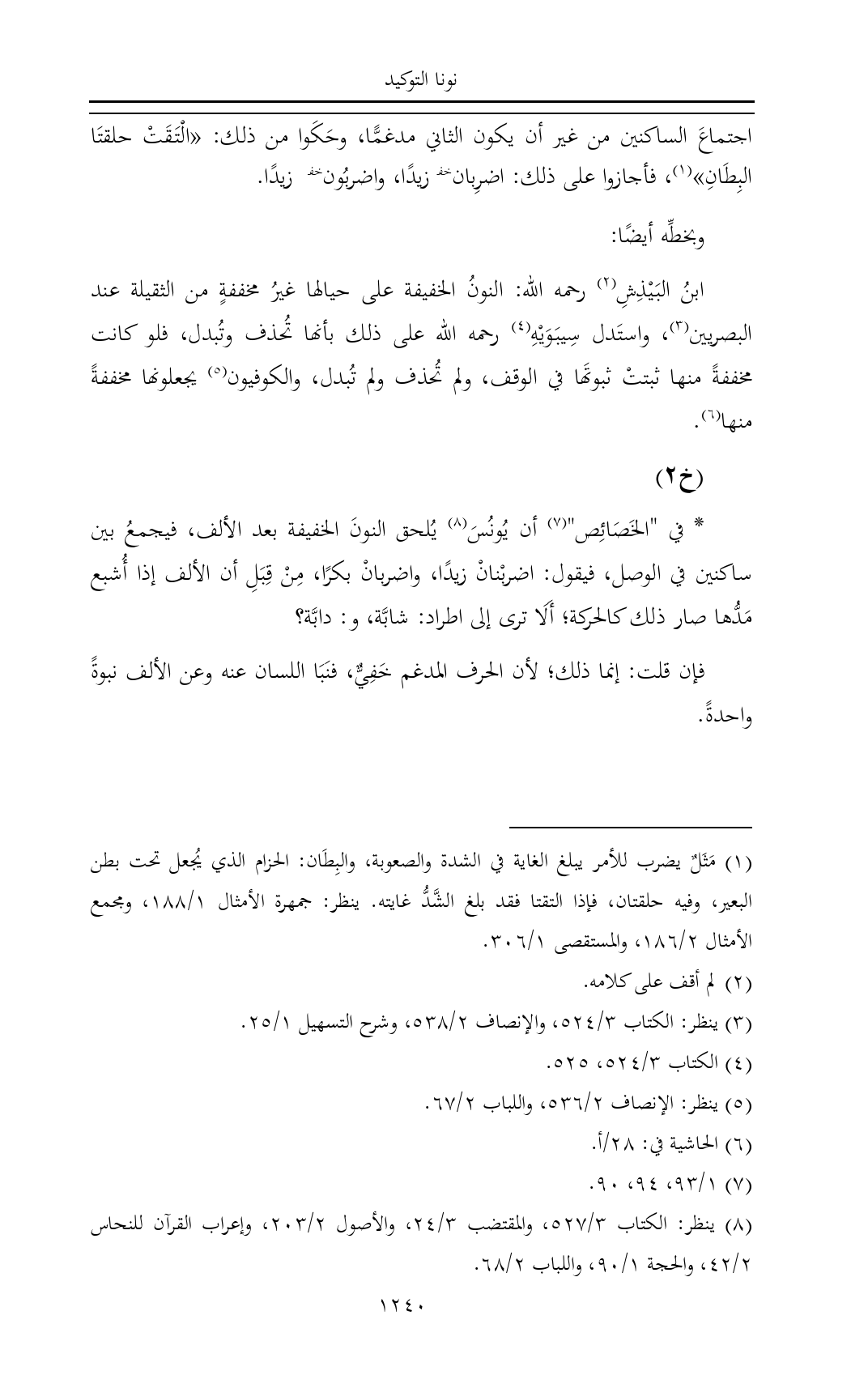 * في "الخَصَائِص" (¬٧) أن يُونُسَ (¬٨) يُلحق النونَ الخفيفة بعد الألف، فيجمعُ بين ساكنين في الوصل، فيقول: اضربْنانْ زيدًا، واضربانْ بكرًا، مِنْ قِبَلِ أن الألف إذا أُشبع مَدُّها صار ذلك كالحركة؛ أَلَا ترى إلى اطراد: شابَّة، و: دابَّة؟