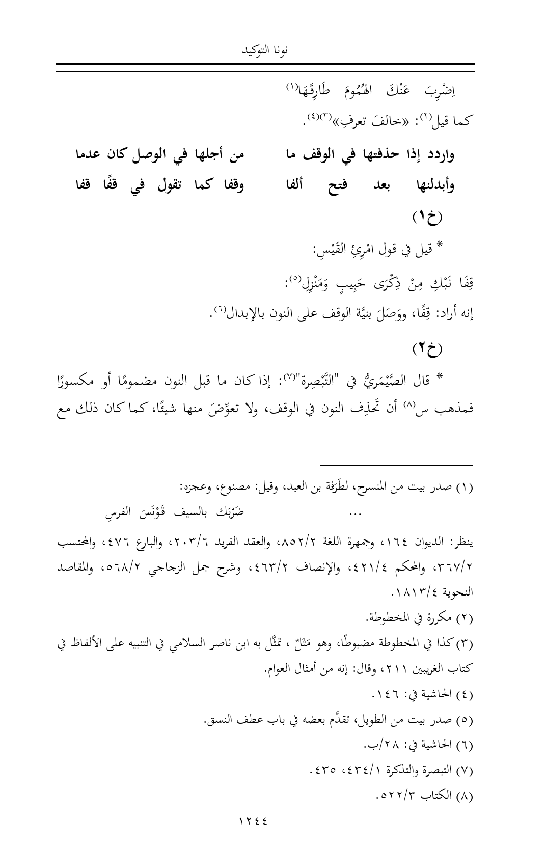 إنه أراد: قِفًا، ووَصَلَ بنيَّة الوقف على النون بالإبدال (¬٦).