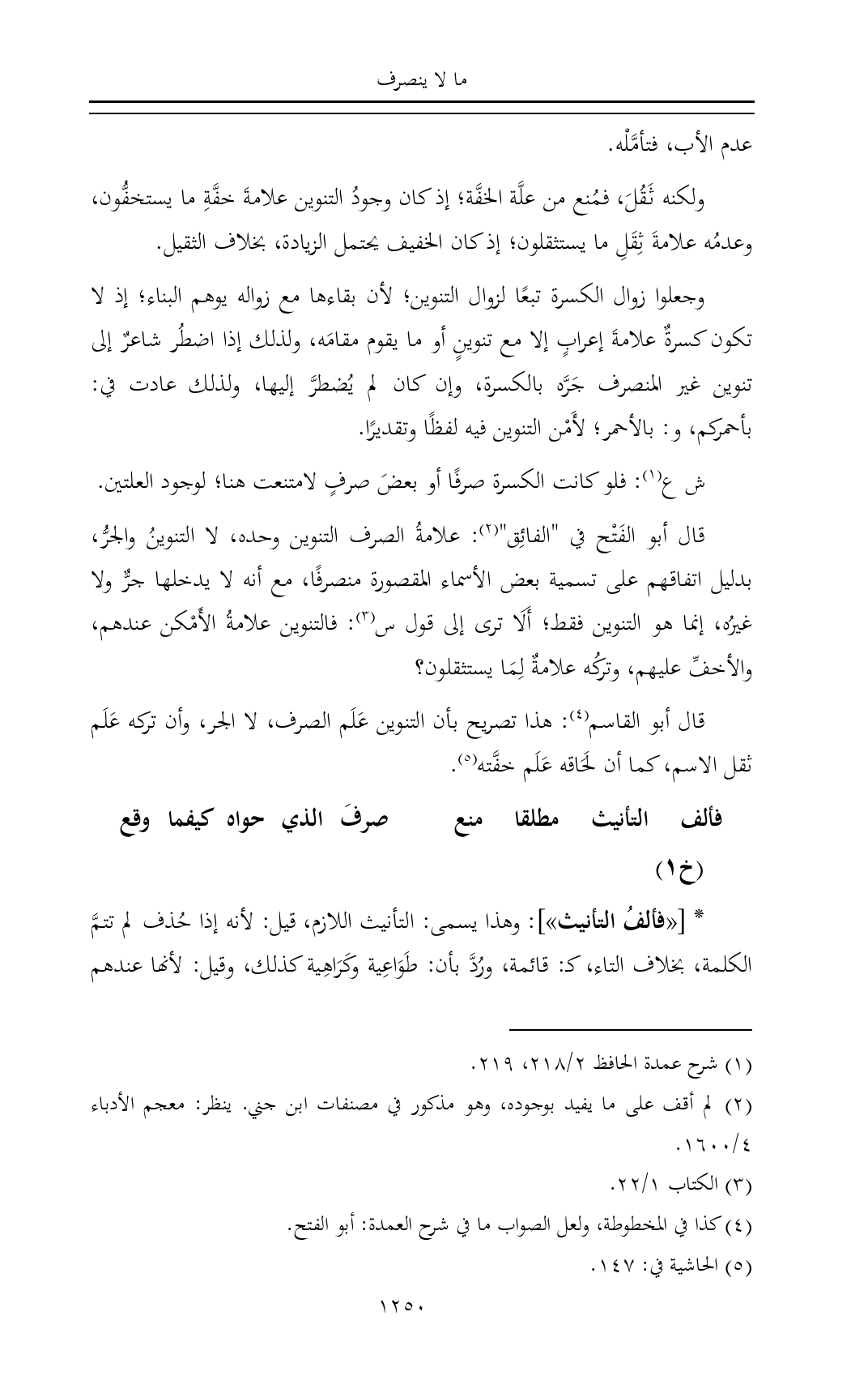 قال أبو الفَتْح في "الفائِق" (¬٢): علامةُ الصرف التنوين وحده، لا التنوينُ والجرُّ، بدليل اتفاقهم على تسمية بعض الأسماء المقصورة منصرفًا، مع أنه لا يدخلها جرٌّ ولا غيرُه، إنما هو التنوين فقط؛ أَلَا ترى إلى قول س (¬٣): فالتنوين علامةُ الأَمْكن عندهم، والأخفِّ عليهم، وتركُه علامةٌ لِمَا يستثقلون؟
