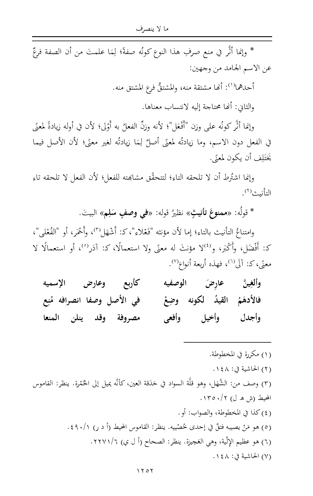 * وإنما أثَّر في منع صرفِ هذا النوع كونُه صفةً؛ لِمَا علمتَ من أن الصفة فرعٌ عن الاسم الجامد من وجهين: