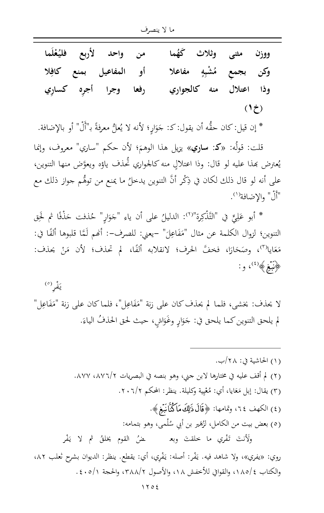 * أبو عَلِيٍّ في "التَّذْكِرة" (¬٢): الدليلُ على أن ياء "جَوَارٍ" حُذفت حَذْفًا ثم لَحِق التنوين؛ لزوال الكلمة عن مثال "مَفَاعِلَ" -يعني: للصرف-: أنهم لَمَّا قلبوها ألفًا في: مَعَايا (¬٣)، وصَحَارَا، فخفَّ الحرف؛ لانقلابه ألفًا، لم تحذف؛ لأن مَنْ يحذف: {نَبْغِ} (¬٤)، و: