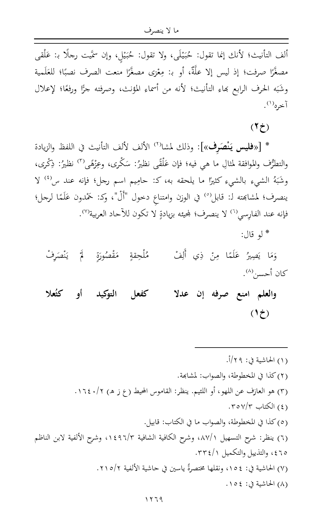 (¬٧) الحاشية في: ١٥٤، ونقلها مختصرةً ياسين في حاشية الألفية ٢/ ٢١٥.