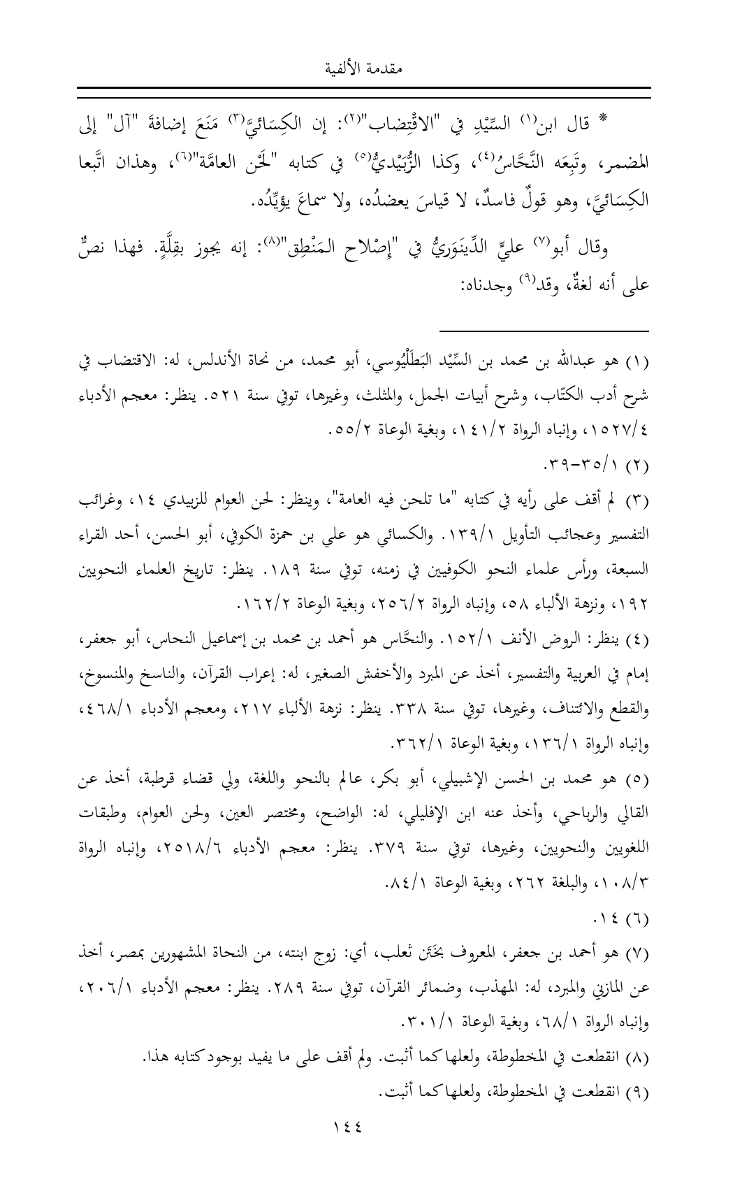 (¬١) هو عبدالله بن محمد بن السِّيْد البَطَلْيُوسي، أبو محمد، من نحاة الأندلس، له: الاقتضاب في شرح أدب الكتّاب، وشرح أبيات الجمل، والمثلث، وغيرها، توفي سنة ٥٢١. ينظر: معجم الأدباء ٤/ ١٥٢٧، وإنباه الرواة ٢/ ١٤١، وبغية الوعاة ٢/ ٥٥.