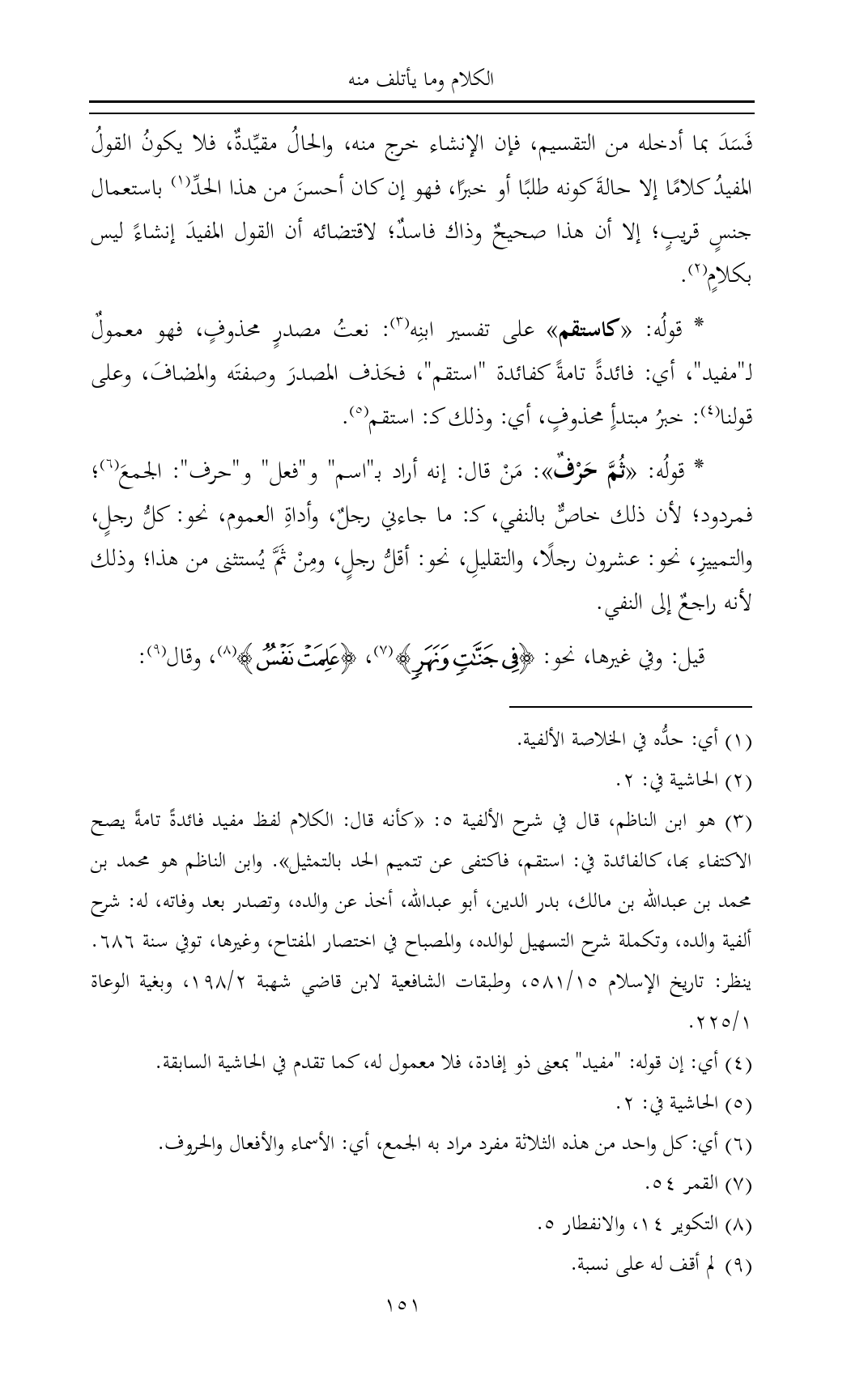 (¬٣) هو ابن الناظم، قال في شرح الألفية ٥: «كأنه قال: الكلام لفظ مفيد فائدةً تامةً يصح الاكتفاء بها، كالفائدة في: استقم، فاكتفى عن تتميم الحد بالتمثيل». وابن الناظم هو محمد بن محمد بن عبدالله بن مالك، بدر الدين، أبو عبدالله، أخذ عن والده، وتصدر بعد وفاته، له: شرح ألفية والده، وتكملة شرح التسهيل لوالده، والمصباح في اختصار المفتاح، وغيرها، توفي سنة ٦٨٦. ينظر: تاريخ الإسلام ١٥/ ٥٨١، وطبقات الشافعية لابن قاضي شهبة ٢/ ١٩٨، وبغية الوعاة ١/ ٢٢٥.