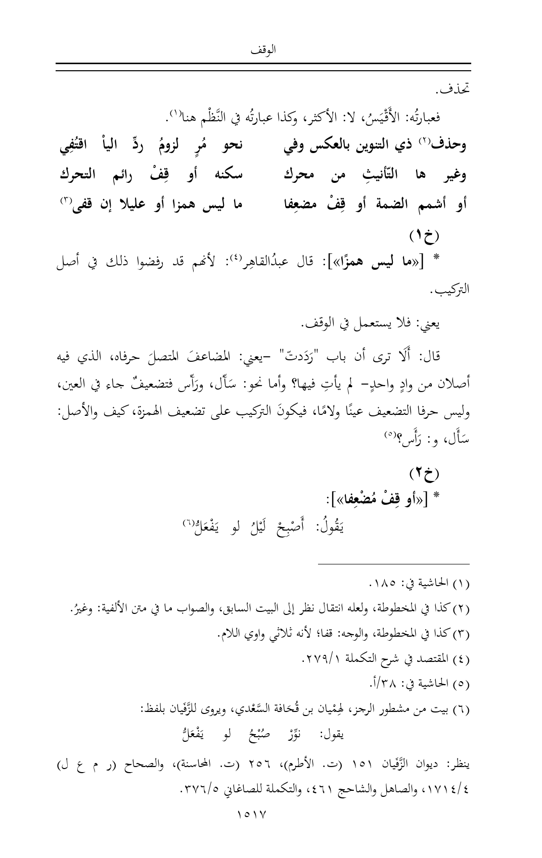 أو أشمم الضمة أو قِفْ مضعِفا ... ما ليس همزا أو عليلا إن قفى (¬٣)
