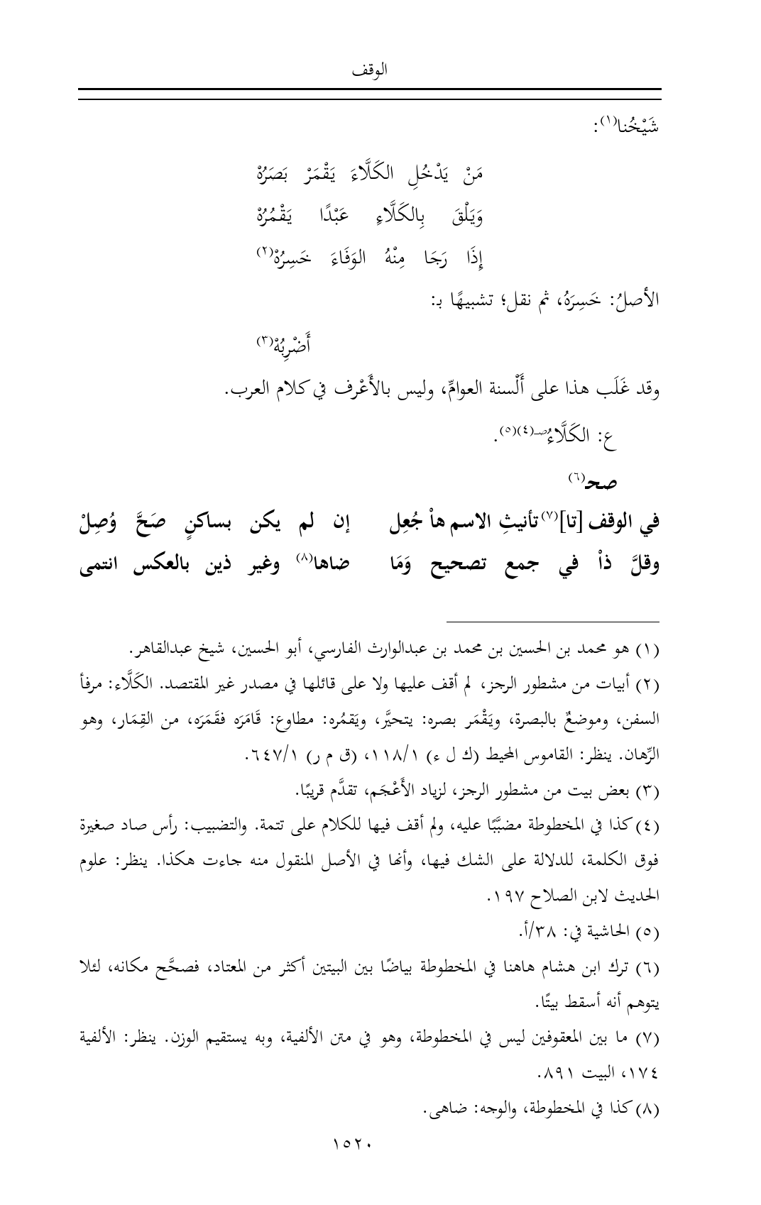 (¬٢) أبيات من مشطور الرجز، لم أقف عليها ولا على قائلها في مصدر غير المقتصد. الكَلَّاء: مرفأ السفن، وموضعٌ بالبصرة، ويَقْمَر بصره: يتحيَّر، ويَقمُره: مطاوع: قَامَرَه فقَمَرَه، من القِمَار، وهو الرِّهان. ينظر: القاموس المحيط (ك ل ء) ١/ ١١٨، (ق م ر) ١/ ٦٤٧.