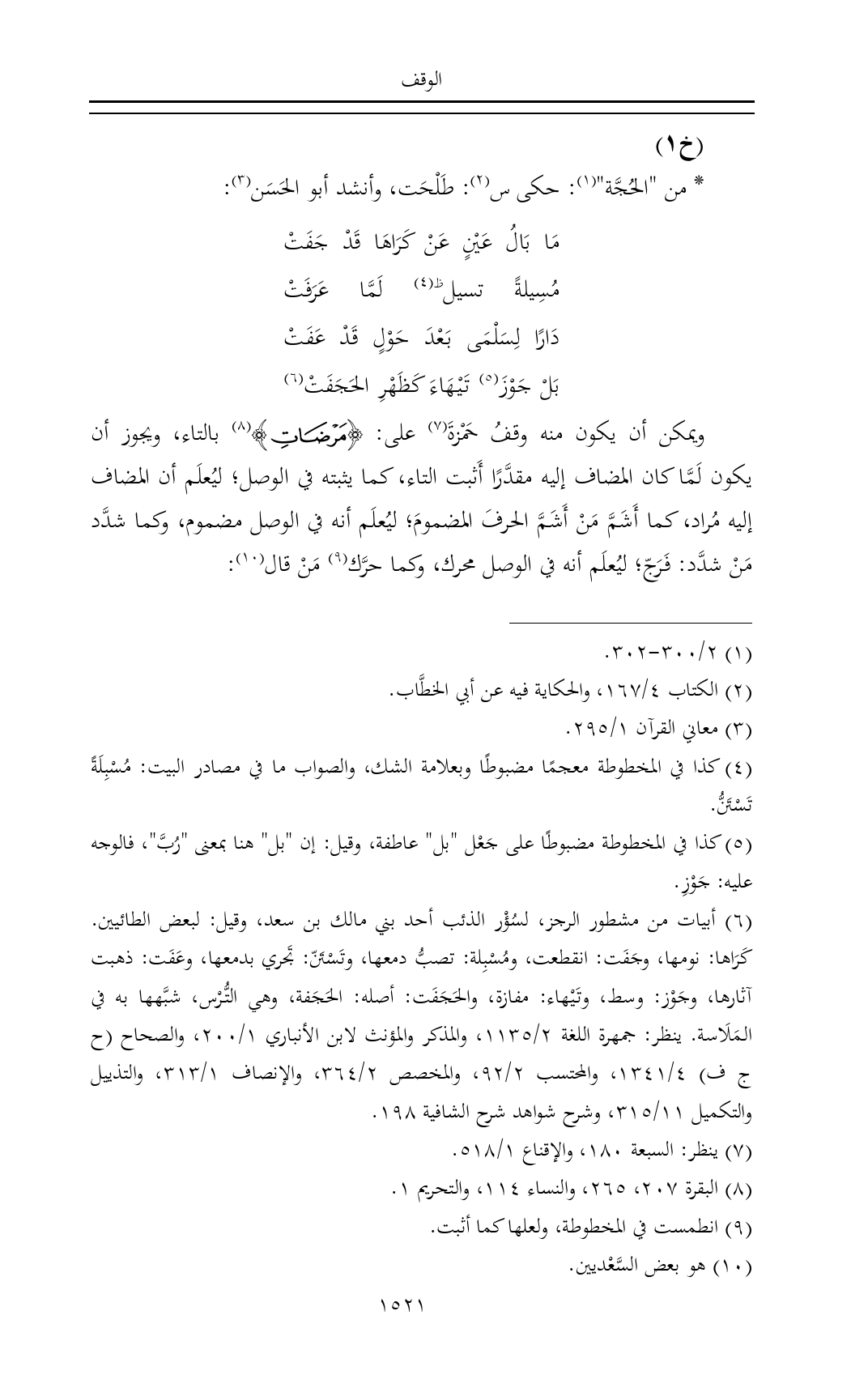 ويمكن أن يكون منه وقفُ حَمْزةَ (¬٧) على: {مَرْضَاتِ} (¬٨) بالتاء، ويجوز أن يكون لَمَّا كان المضاف إليه مقدَّرًا أَثبت التاء، كما يثبته في الوصل؛ ليُعلَم أن المضاف إليه مُراد، كما أَشَمَّ مَنْ أَشَمَّ الحرفَ المضمومَ؛ ليُعلَم أنه في الوصل مضموم، وكما شدَّد مَنْ شدَّد: فَرَجّ؛ ليُعلَم أنه في الوصل محرك، وكما حرَّك (¬٩) مَنْ قال (¬١٠):