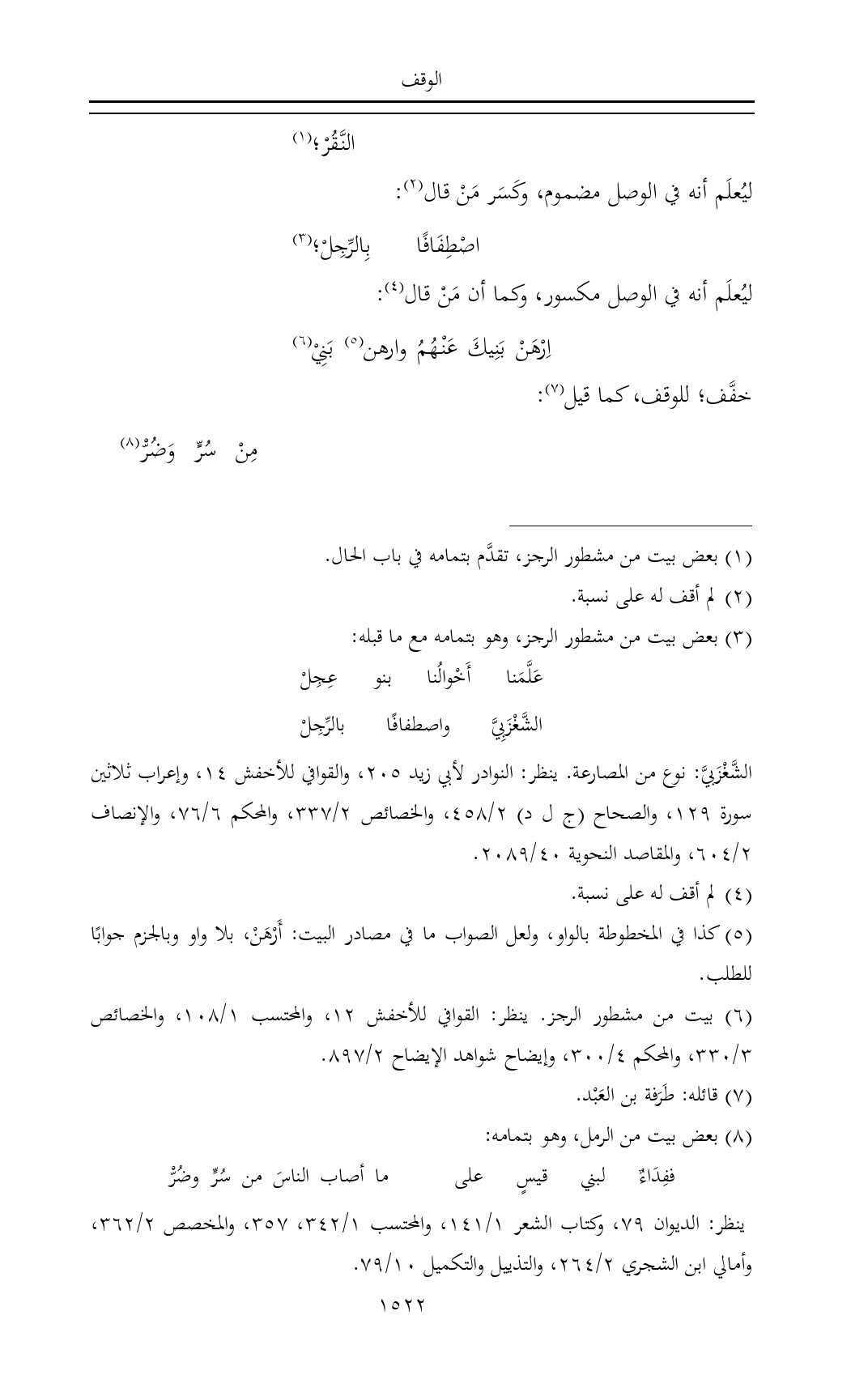 (¬٦) بيت من مشطور الرجز. ينظر: القوافي للأخفش ١٢، والمحتسب ١/ ١٠٨، والخصائص ٣/ ٣٣٠، والمحكم ٤/ ٣٠٠، وإيضاح شواهد الإيضاح ٢/ ٨٩٧.