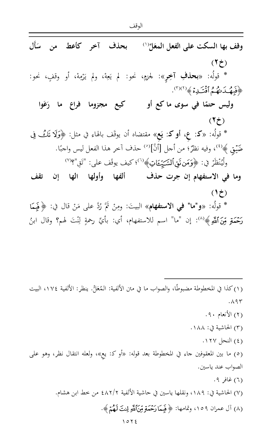 * قولُه: «كـ: عِ، أو كـ: يَعِ» مقتضاه أن يوقَف بالهاء في مثل: {وَلَا تَكُ فِي ضَيْقٍ} (¬٤)، وفيه نظرٌ؛ من أجل [أنَّ] (¬٥) حذف آخر هذا الفعل ليس واجبًا.