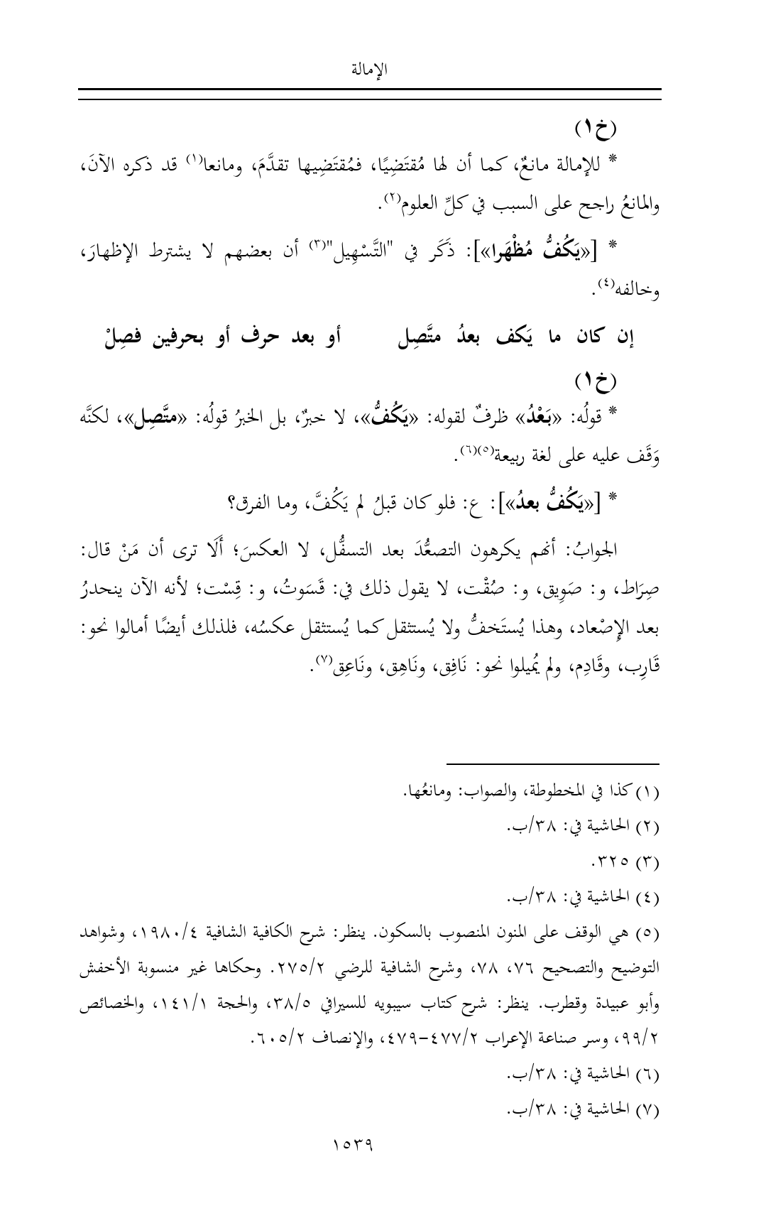* قولُه: «بَعْدُ» ظرفٌ لقوله: «يَكُفُّ»، لا خبرٌ، بل الخبرُ قولُه: «متَّصِل»، لكنَّه وَقَف عليه على لغة ربيعة (¬٥) (¬٦).