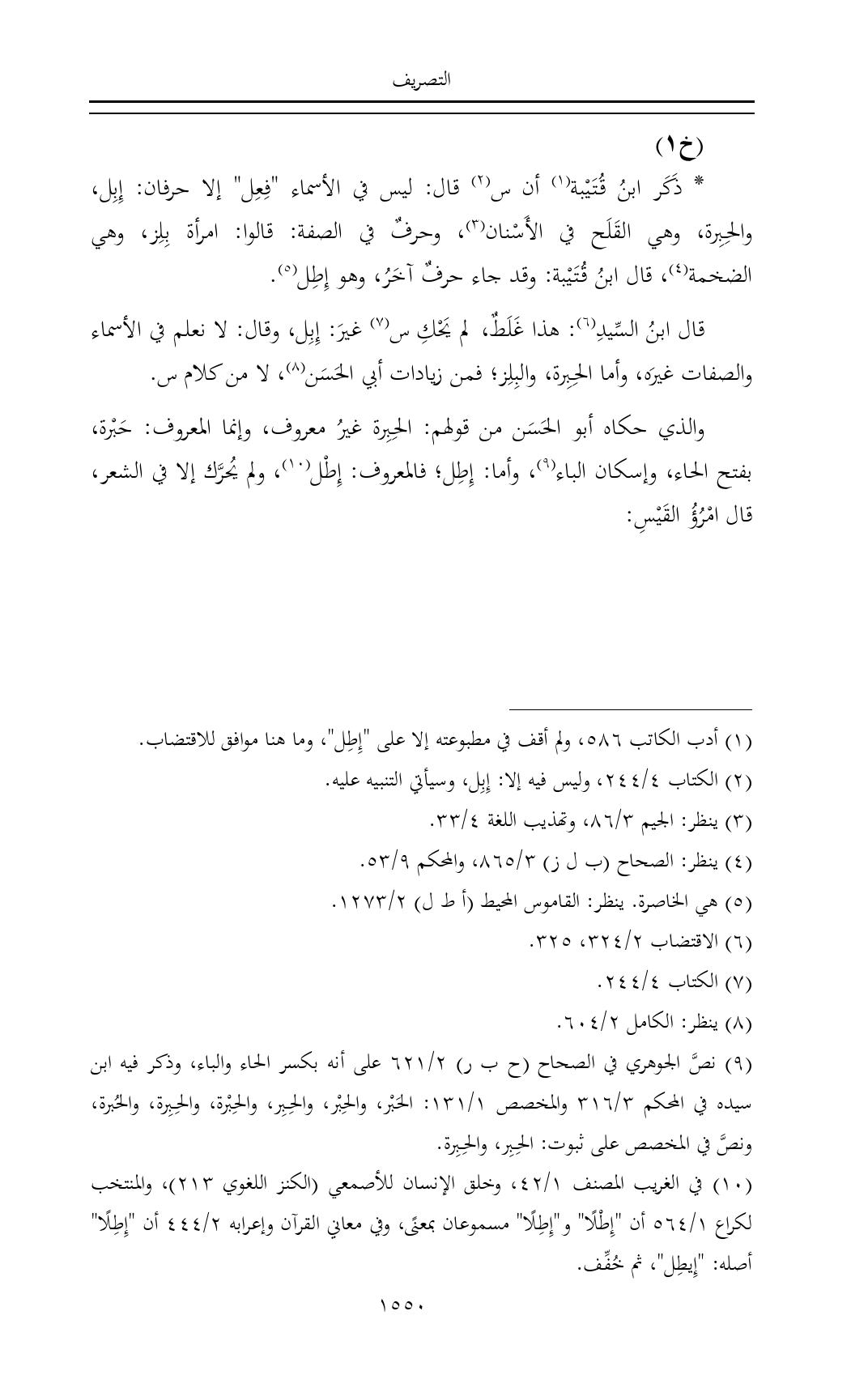 قال ابنُ السِّيدِ (¬٦): هذا غَلَطٌ، لم يَحْكِ س (¬٧) غيرَ: إِبِل، وقال: لا نعلم في الأسماء والصفات غيرَه، وأما الحِبِرة، والبِلِز؛ فمن زيادات أبي الحَسَن (¬٨)، لا من كلام س.
