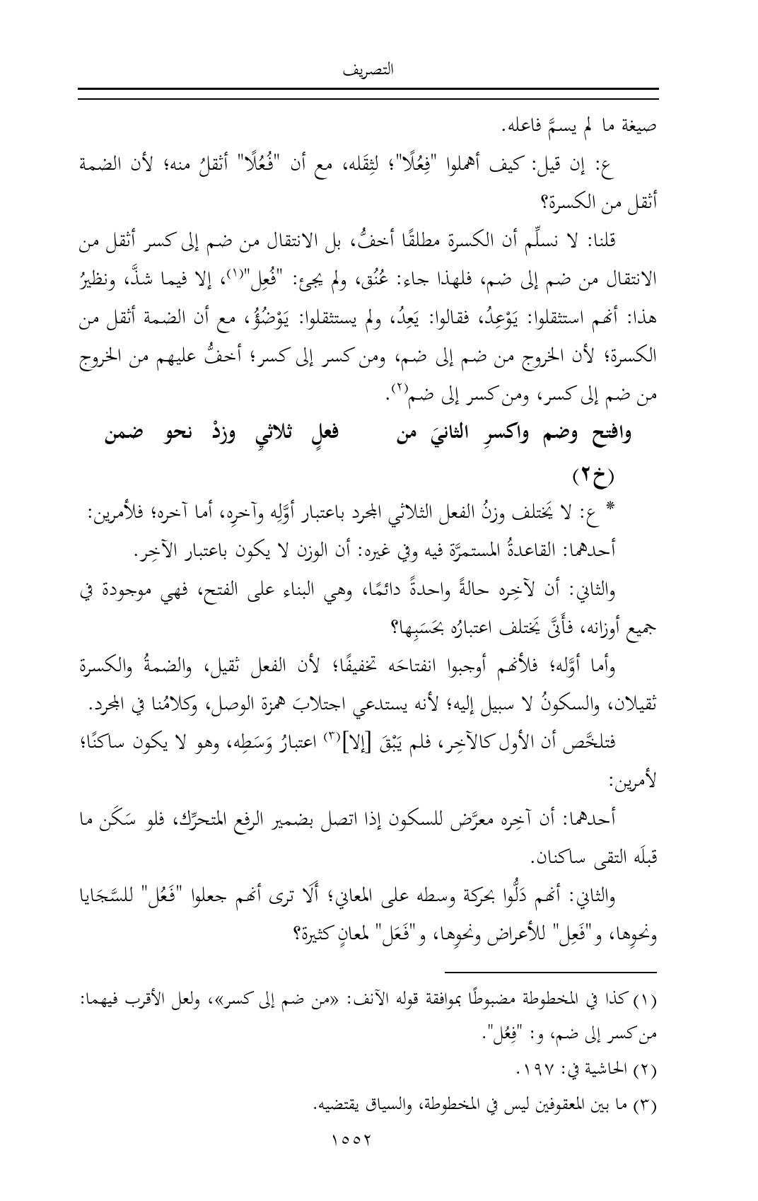 (¬١) كذا في المخطوطة مضبوطًا بموافقة قوله الآنف: «من ضم إلى كسر»، ولعل الأقرب فيهما: من كسر إلى ضم، و: "فِعُل".