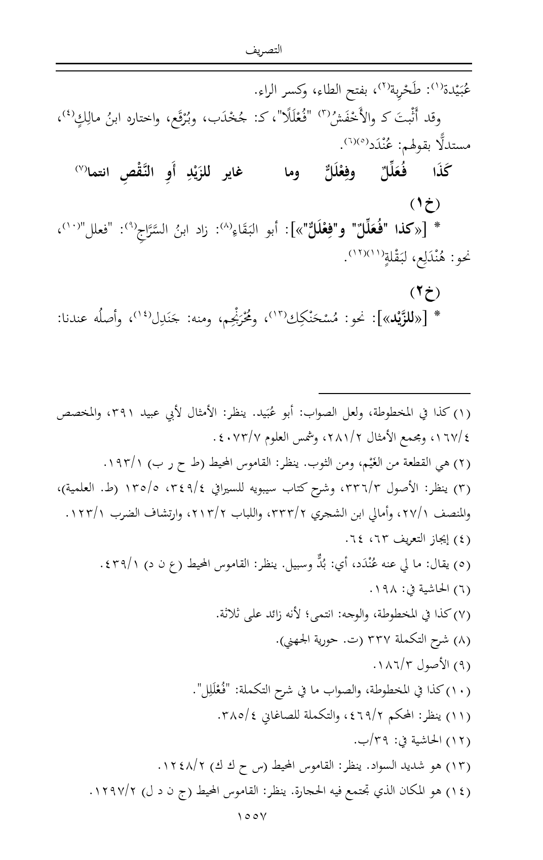 * [«للزَّيْد»]: نحو: مُسْحَنْكِك (¬١٣)، ومُحْرَنْجِم، ومنه: جَنَدِل (¬١٤)، وأصلُه عندنا: