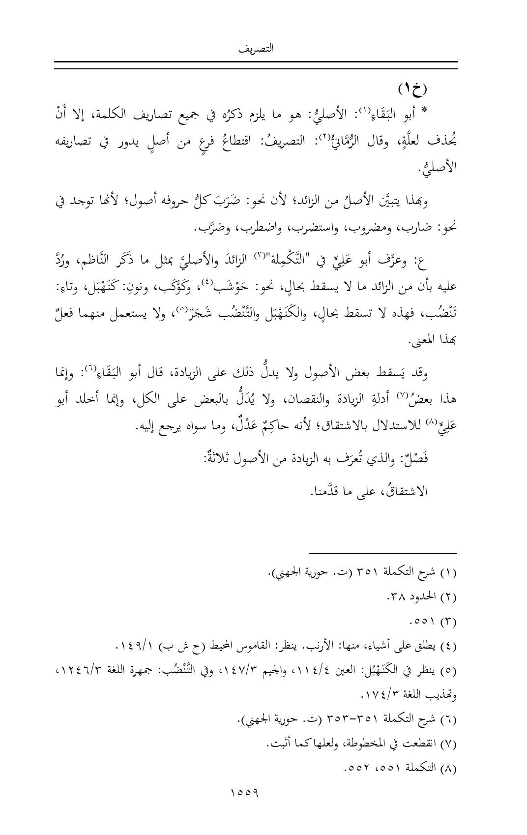 * أبو البَقَاءِ (¬١): الأصليُّ: هو ما يلزم ذكرُه في جميع تصاريف الكلمة، إلا أَنْ يُحذف لعلَّةٍ، وقال الرُّمَّانيُّ (¬٢): التصريفُ: اقتطاعُ فرعٍ من أصلٍ يدور في تصاريفه الأصليُّ.