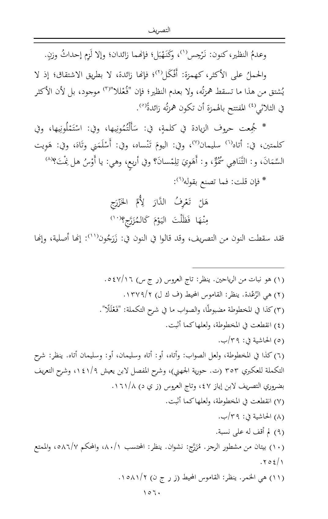 (¬٦) كذا في المخطوطة، ولعل الصواب: وأتاه، أو: أتاه وسليمان، أو: وسليمان أتاه. ينظر: شرح التكملة للعكبري ٣٥٣ (ت. حورية الجهني)، وشرح المفصل لابن يعيش ٩/ ١٤١، وشرح التعريف بضروري التصريف لابن إياز ٤٧، وتاج العروس (ز ي د) ٨/ ١٦١.