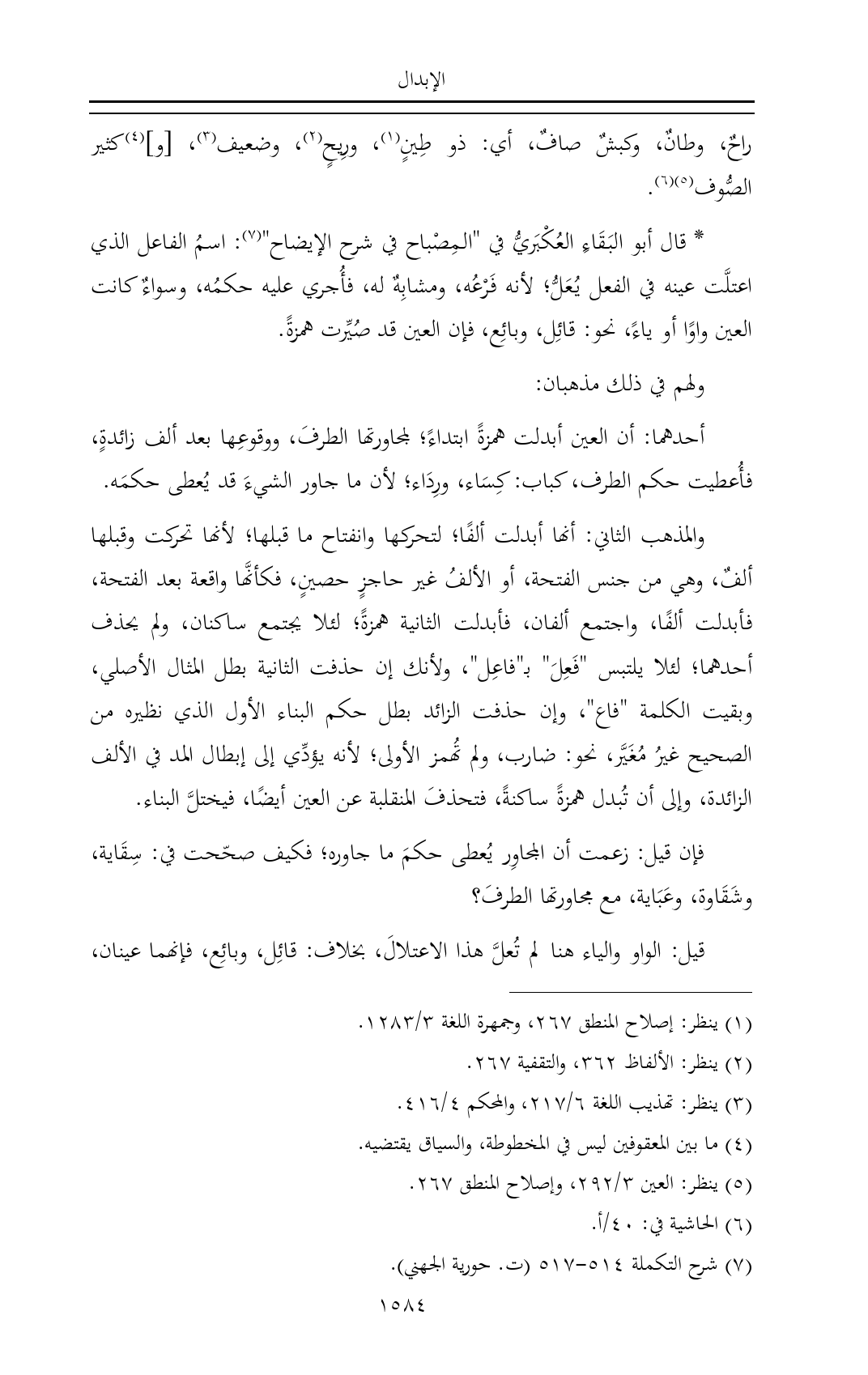 * قال أبو البَقَاءِ العُكْبَريُّ في "المِصْباح في شرح الإيضاح" (¬٧): اسمُ الفاعل الذي اعتلَّت عينه في الفعل يُعَلُّ؛ لأنه فَرْعُه، ومشابِهٌ له، فأُجري عليه حكمُه، وسواءٌ كانت العين واوًا أو ياءً، نحو: قائِل، وبائِع، فإن العين قد صُيِّرت همزةً.