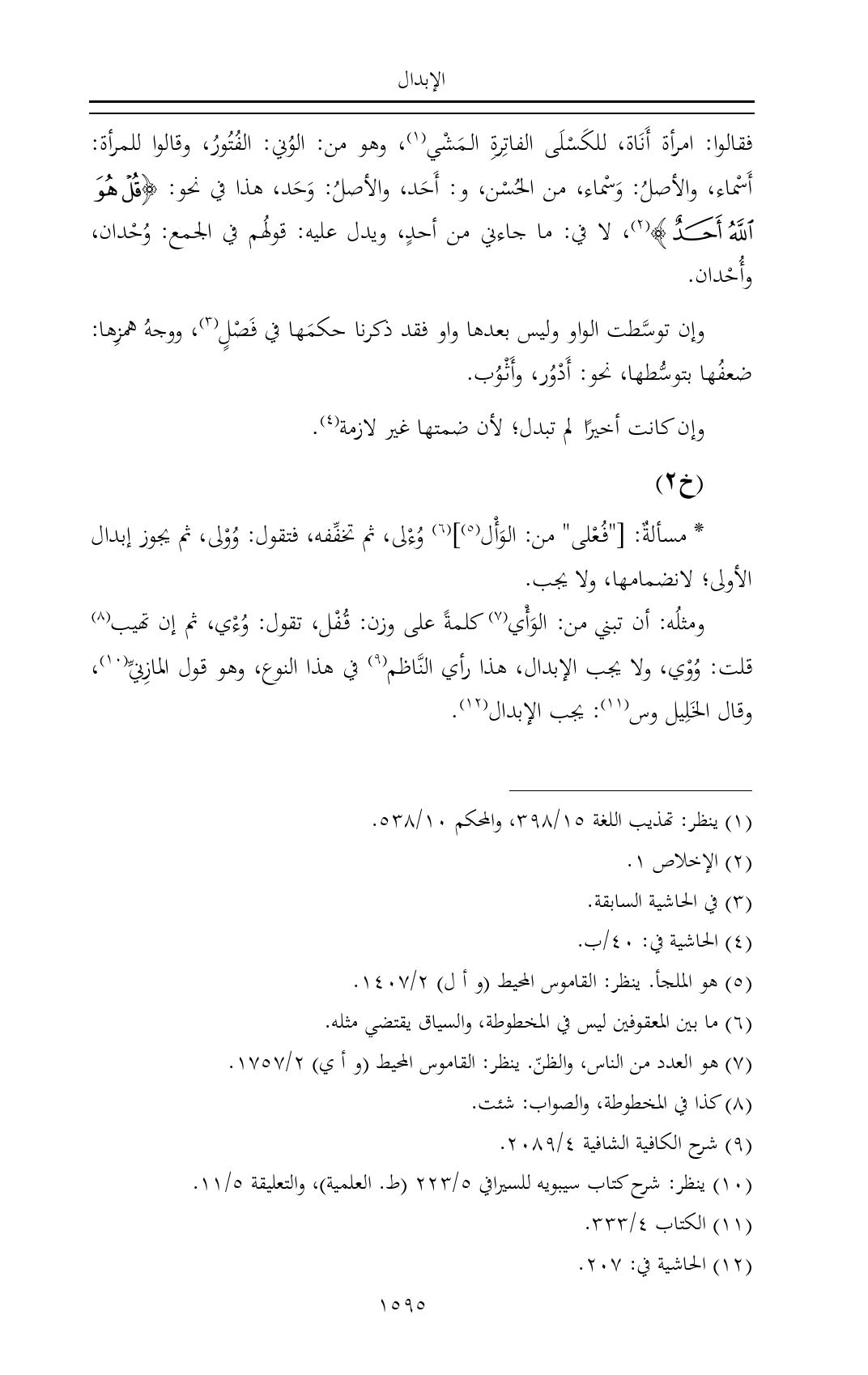 ومثلُه: أن تبني من: الوَأْي (¬٧) كلمةً على وزن: قُفْل، تقول: وُءْي، ثم إن تهيب (¬٨) قلت: وُوْي، ولا يجب الإبدال، هذا رأي النَّاظم (¬٩) في هذا النوع، وهو قول المازِنيِّ (¬١٠)، وقال الخَلِيل وس (¬١١): يجب الإبدال (¬١٢).