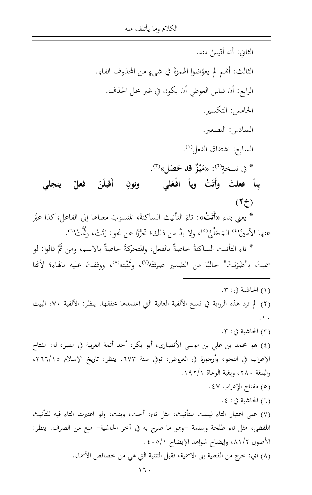 (¬٢) لم ترد هذه الرواية في نسخ الألفية العالية التي اعتمدها محققها. ينظر: الألفية ٧٠، البيت ١٠.