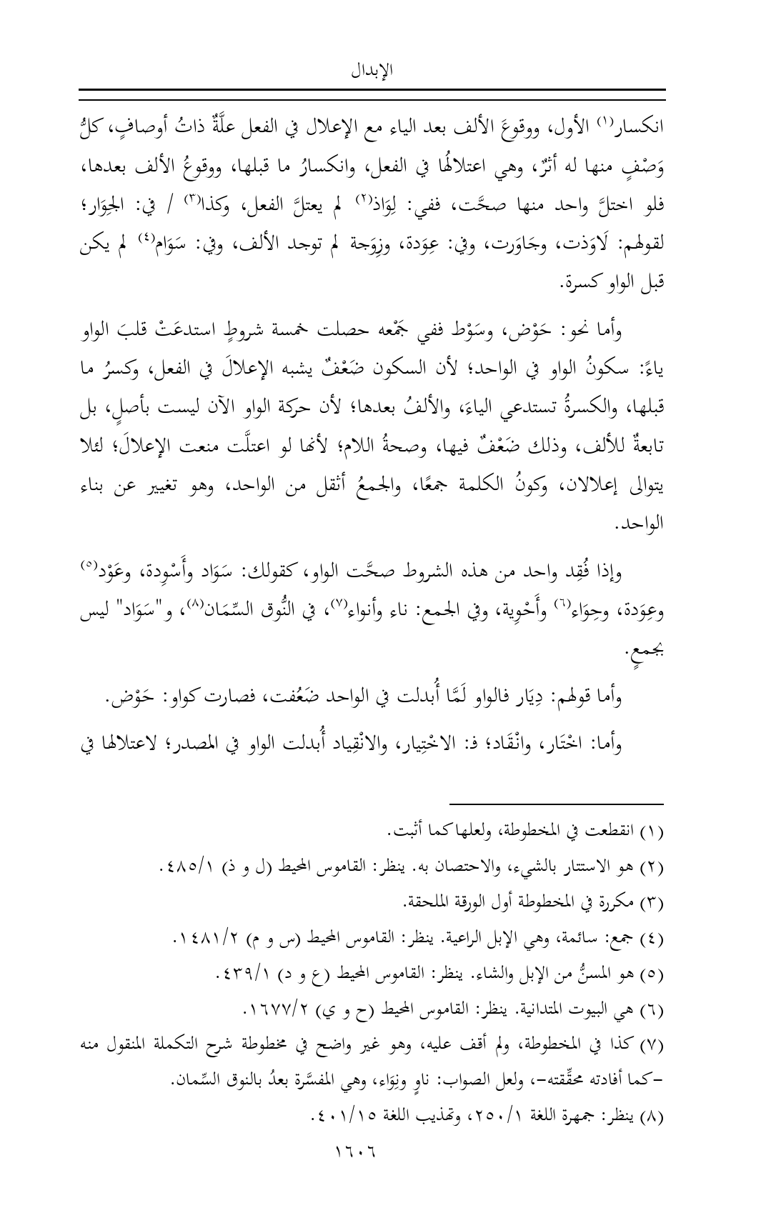انكسار (¬١) الأول، ووقوعَ الألف بعد الياء مع الإعلال في الفعل علَّةٌ ذاتُ أوصافٍ، كلُّ وَصْفٍ منها له أثرٌ، وهي اعتلالُها في الفعل، وانكسارُ ما قبلها، ووقوعُ الألف بعدها، فلو اختلَّ واحد منها صحَّت، ففي: لِوَاذ (¬٢) لم يعتلَّ الفعل، وكذا (¬٣) / في: الجِوَار؛ لقولهم: لَاوَذت، وجَاوَرت، وفي: عِوَدة، وزِوَجة لم توجد الألف، وفي: سَوَام (¬٤) لم يكن قبل الواو كسرة.