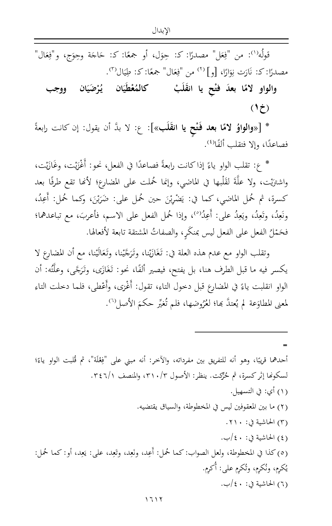 * [«والواوُ لامًا بعد فَتْحٍ يا انقَلَب»]: ع: لا بدَّ أن يقول: إن كانت رابعةً فصاعدًا، وإلا فتقلب ألفًا (¬٤).