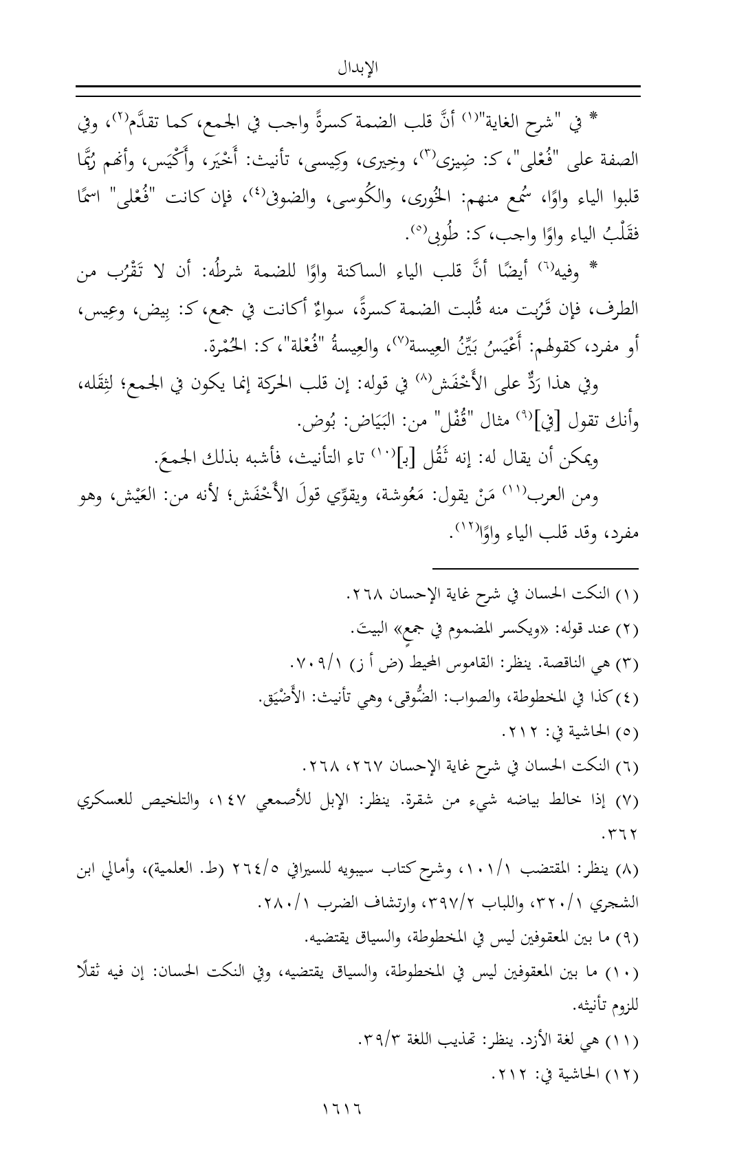 * وفيه (¬٦) أيضًا أنَّ قلب الياء الساكنة واوًا للضمة شرطُه: أن لا تَقْرُب من الطرف، فإن قَرُبت منه قُلبت الضمة كسرةً، سواءٌ أكانت في جمع، كـ: بِيض، وعِيس، أو مفرد، كقولهم: أَعْيَسُ بَيِّنُ العِيسة (¬٧)، والعِيسةُ "فُعْلة"، كـ: الحُمْرة.
