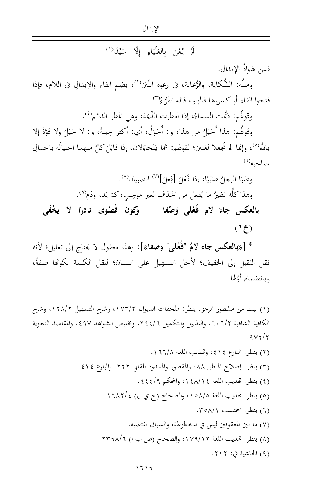 ومثلُه: الشُّكاية، والرُّغاية، في رغوة اللَبَن (¬٢)، بضم الفاء والإبدالِ في اللام، فإذا فتحوا الفاء أو كسروها فالواو، قاله الفَرَّاءُ (¬٣).