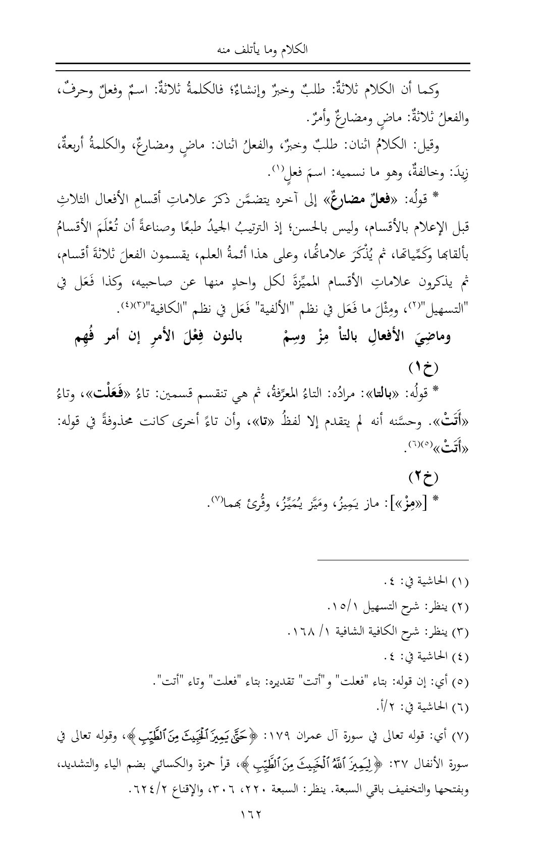 * قولُه: «فعلٌ مضارعٌ» إلى آخره يتضمَّن ذكرَ علاماتِ أقسامِ الأفعال الثلاثِ قبل الإعلام بالأقسام، وليس بالحسن؛ إذ الترتيبُ الجيدُ طبعًا وصناعةً أن تُعْلَمَ الأقسامُ بألقابها وكَمِّياتها، ثم يُذْكَرَ علاماتُها، وعلى هذا أئمةُ العلم، يقسمون الفعلَ ثلاثةَ أقسام، ثم يذكرون علاماتِ الأقسام المميِّزةَ لكل واحدٍ منها عن صاحبيه، وكذا فَعَل في "التسهيل" (¬٢)، ومِثْلَ ما فَعَل في نظم "الألفية" فَعَل في نظم "الكافية" (¬٣) (¬٤).