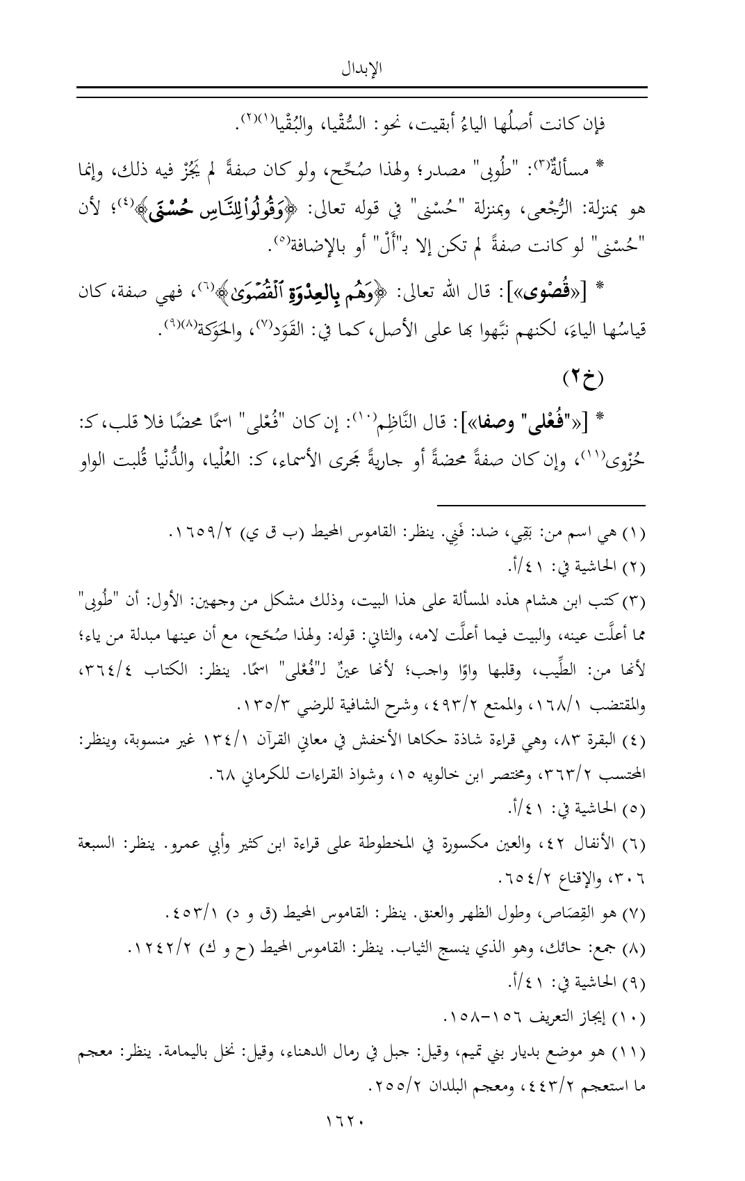 * مسألةٌ (¬٣): "طُوبى" مصدر؛ ولهذا صُحِّح، ولو كان صفةً لم يَجُزْ فيه ذلك، وإنما هو بمنزلة: الرُّجْعى، وبمنزلة "حُسْنى" في قوله تعالى: {وَقُولُوا لِلنَّاسِ حُسْنَى} (¬٤)؛ لأن "حُسْنى" لو كانت صفةً لم تكن إلا بـ"أَلْ" أو بالإضافة (¬٥).