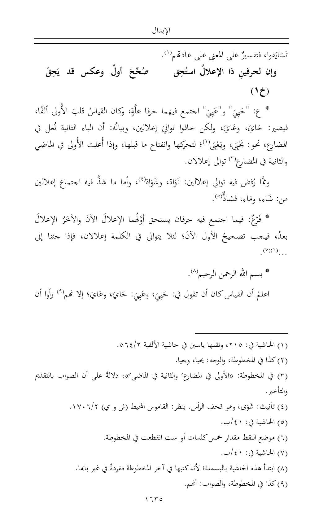اعلمْ أن القياس كان أن تقول في: حَيِيَ، وعَيِيَ: حَايَ، وعَايَ؛ إلا نهم (¬٩) رأوا أن