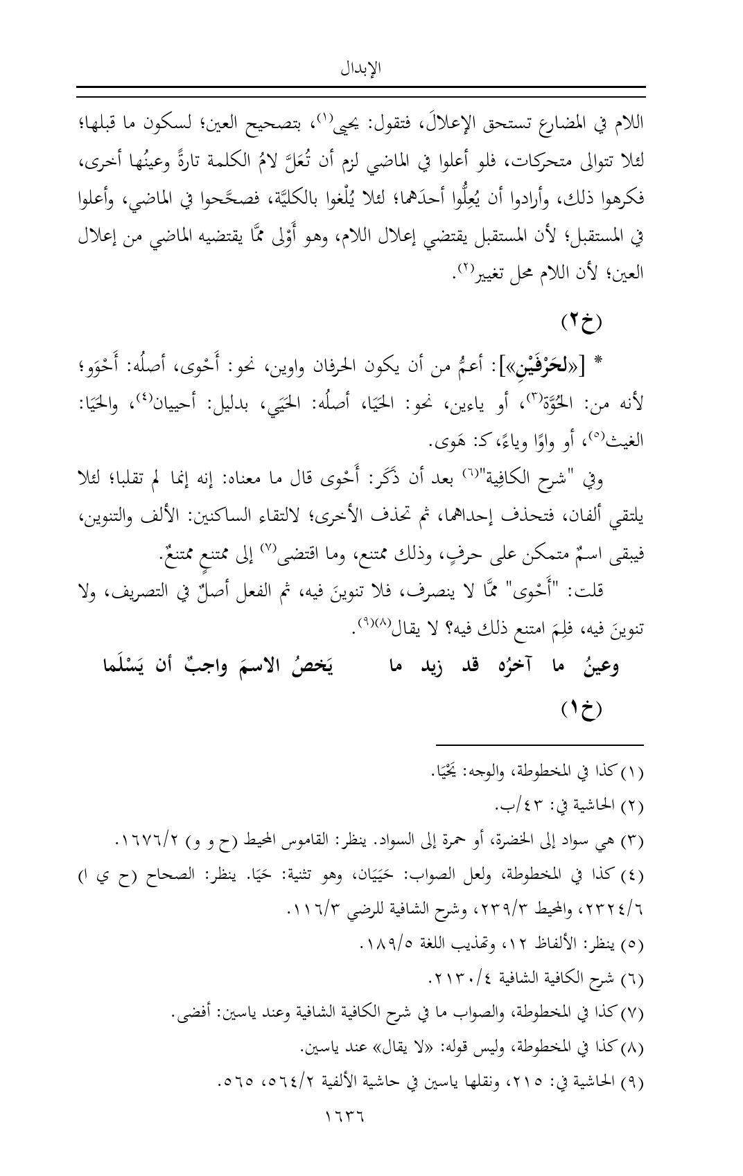 * [«لحَرْفَيْنِ»]: أعمُّ من أن يكون الحرفان واوين، نحو: أَحْوى، أصلُه: أَحْوَو؛ لأنه من: الحُوَّة (¬٣)، أو ياءين، نحو: الحَيَا، أصلُه: الحَيَي، بدليل: أحييان (¬٤)، والحَيَا: الغيث (¬٥)، أو واوًا وياءً، كـ: هَوى.