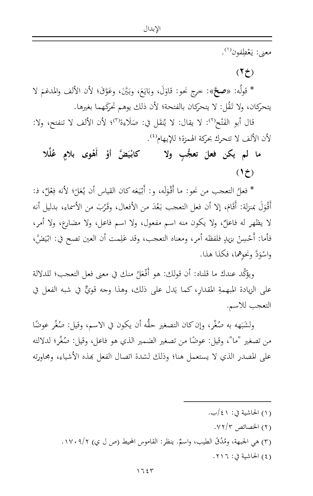 * فعلُ التعجب من نحو: ما أَقْوَلَه، و: أَبْيَعَه كان القياس أن يُعَلّ؛ لأنه فِعْلٌ، فـ: أَقْوَلَ بمنزلة: أَقَامَ، إلا أن فعل التعجب بَعُدَ من الأفعال، وقَرُبَ من الأسماء، بدليل أنه لا يظهر له فاعلٌ، ولا يكون منه اسم مفعول، ولا اسم فاعل، ولا مضارع، ولا أمر، فأما: أَحْسِنْ بزيدٍ فلفظه أمر، ومعناه التعجب، وقد عَلِمت أن العين تصح في: ابْيَضَّ، واسْوَدَّ ونحوِهما، فكذا هذا.