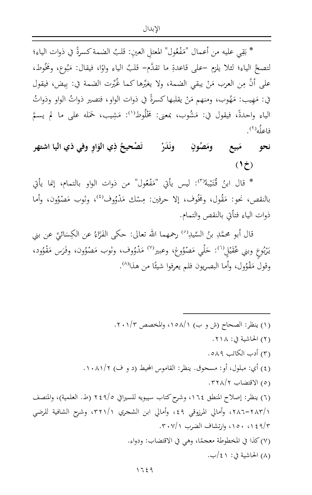 (¬٦) ينظر: إصلاح المنطق ١٦٤، وشرح كتاب سيبويه للسيرافي ٥/ ٢٤٩ (ط. العلمية)، والمنصف ١/ ٢٨٣ - ٢٨٦، وأمالي المرزوقي ٤٩، وأمالي ابن الشجري ١/ ٣٢١، وشرح الشافية للرضي ٣/ ١٤٩، ١٥٠، وارتشاف الضرب ١/ ٣٠٧.