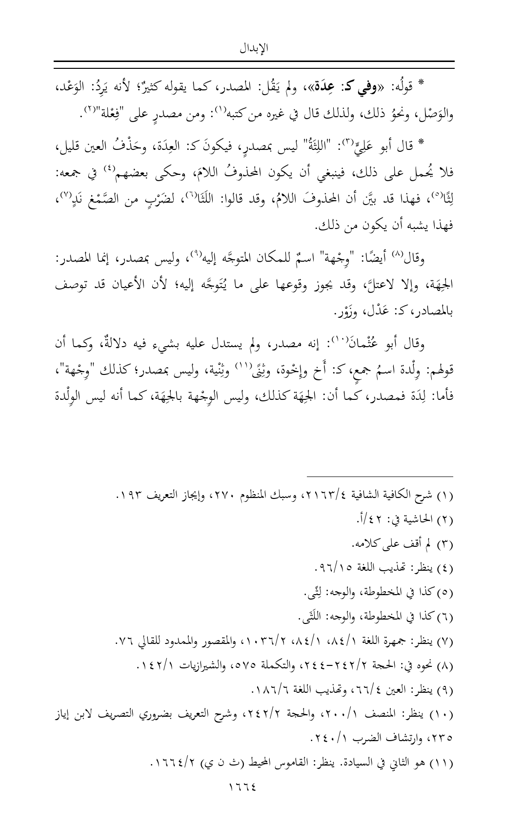 وقال أبو عُثْمانَ (¬١٠): إنه مصدر، ولم يستدل عليه بشيء فيه دلالةٌ، وكما أن قولهم: وِلْدة اسمُ جمعٍ، كـ: أَخ وإِخْوة، وثِنًى (¬١١) وثِنْية، وليس بمصدر؛ كذلك "وِجْهة"، فأما: لِدَة فمصدر، كما أن: الجِهَة كذلك، وليس الوِجْهة بالجِهَة، كما أنه ليس الوِلْدة