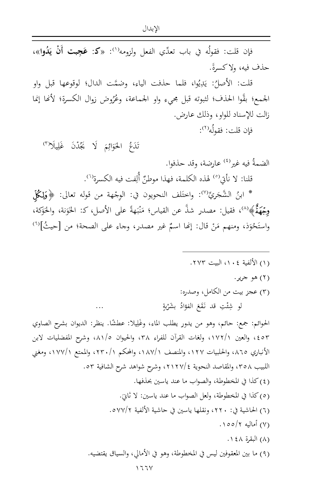 فإن قلت: فقولُه في باب تعدِّي الفعل ولزومه (¬١): «كـ: عَجِبت أَنْ يَدُوا»، حذف فيه، ولا كسرةَ.