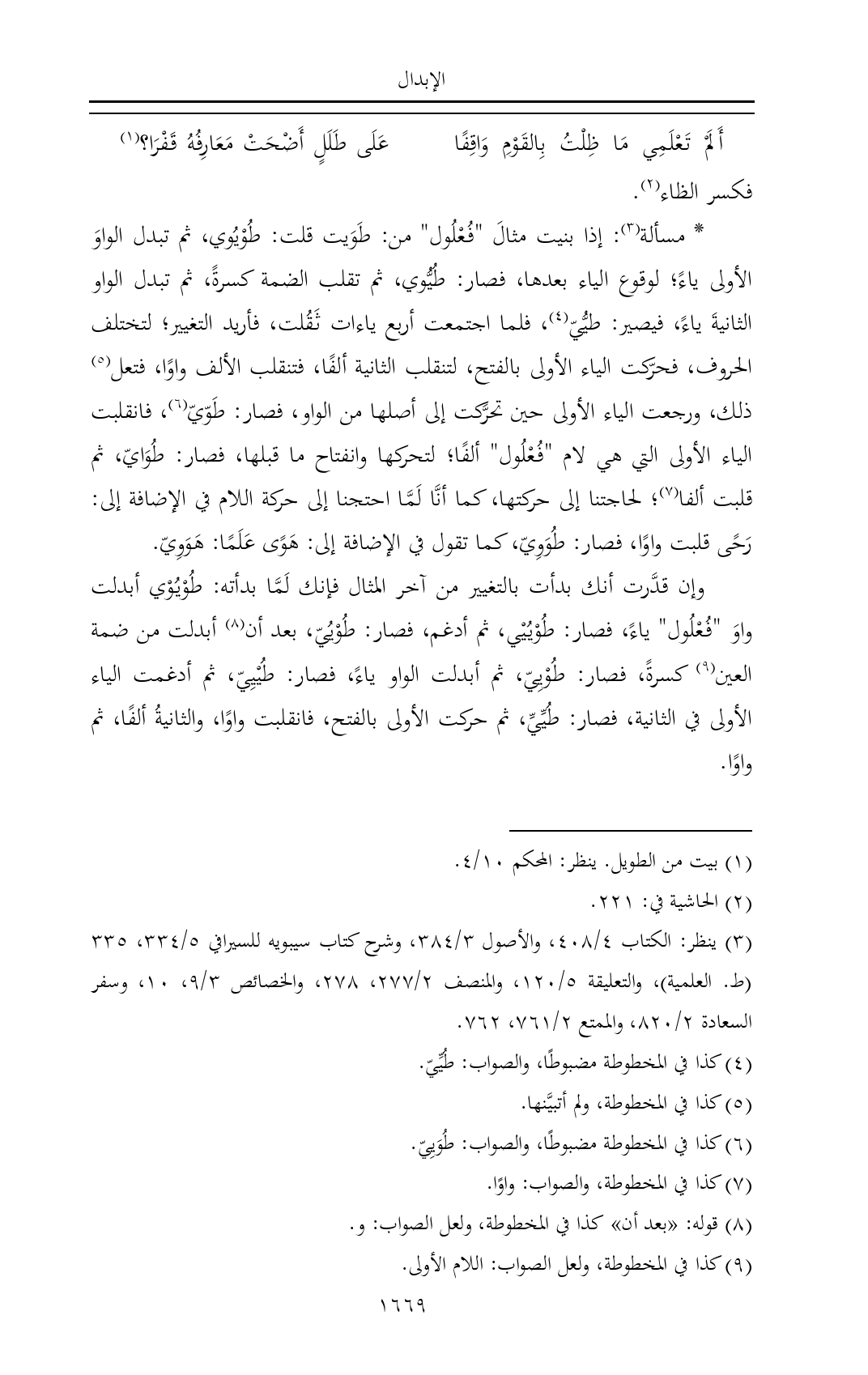 * مسألة (¬٣): إذا بنيت مثالَ "فُعْلُول" من: طَوَيت قلت: طُوْيُوي، ثم تبدل الواوَ الأولى ياءً؛ لوقوع الياء بعدها، فصار: طُيُّوي، ثم تقلب الضمة كسرةً، ثم تبدل الواو الثانيةَ ياءً، فيصير: طيُّيّ (¬٤)، فلما اجتمعت أربع ياءات ثَقُلت، فأريد التغيير؛ لتختلف الحروف، فحرّكت الياء الأولى بالفتح، لتنقلب الثانية ألفًا، فتنقلب الألف واوًا، فتعل (¬٥) ذلك، ورجعت الياء الأولى حين تحرَّكت إلى أصلها من الواو، فصار: طَوّيّ (¬٦)، فانقلبت الياء الأولى التي هي لام "فُعْلُول" ألفًا؛ لتحركها وانفتاح ما قبلها، فصار: طُوَايّ، ثم قلبت ألفا (¬٧)؛ لحاجتنا إلى حركتها، كما أنَّا لَمَّا احتجنا إلى حركة اللام في الإضافة إلى: رَحًى قلبت واوًا، فصار: طُوَوِيّ، كما تقول في الإضافة إلى: هَوًى عَلَمًا: هَوَوِيّ.