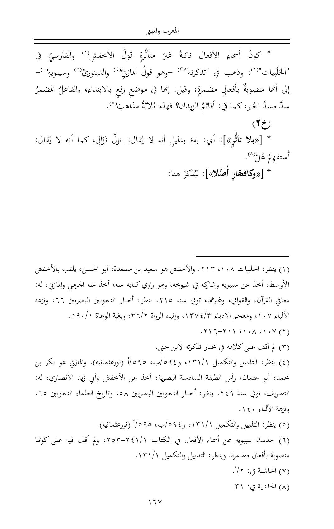 (¬٤) ينظر: التذييل والتكميل ١/ ١٣١، و ٥٩٤/ب، ٥٩٥/أ (نورعثمانيه). والمازني هو بكر بن محمد، أبو عثمان، رأس الطبقة السادسة البصرية، أخذ عن الأخفش وأبي زيد الأنصاري، له: التصريف، توفي سنة ٢٤٩. ينظر: أخبار النحويين البصريين ٥٨، وتاريخ العلماء النحويين ٦٥، ونزهة الألباء ١٤٠.