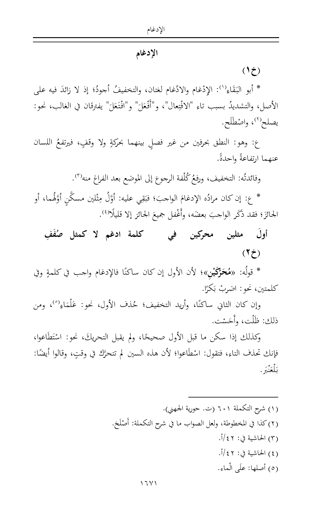 * ع: إن كان مرادُه الإدغامَ الواجبَ؛ فبَقِي عليه: أوَّلُ مِثْلين مسكَّنٍ أوَّلُهما، أو الجائزَ؛ فقد ذَكَر الواجبَ بعضَه، وأَغْفل جميعَ الجائز إلا قليلًا (¬٤).