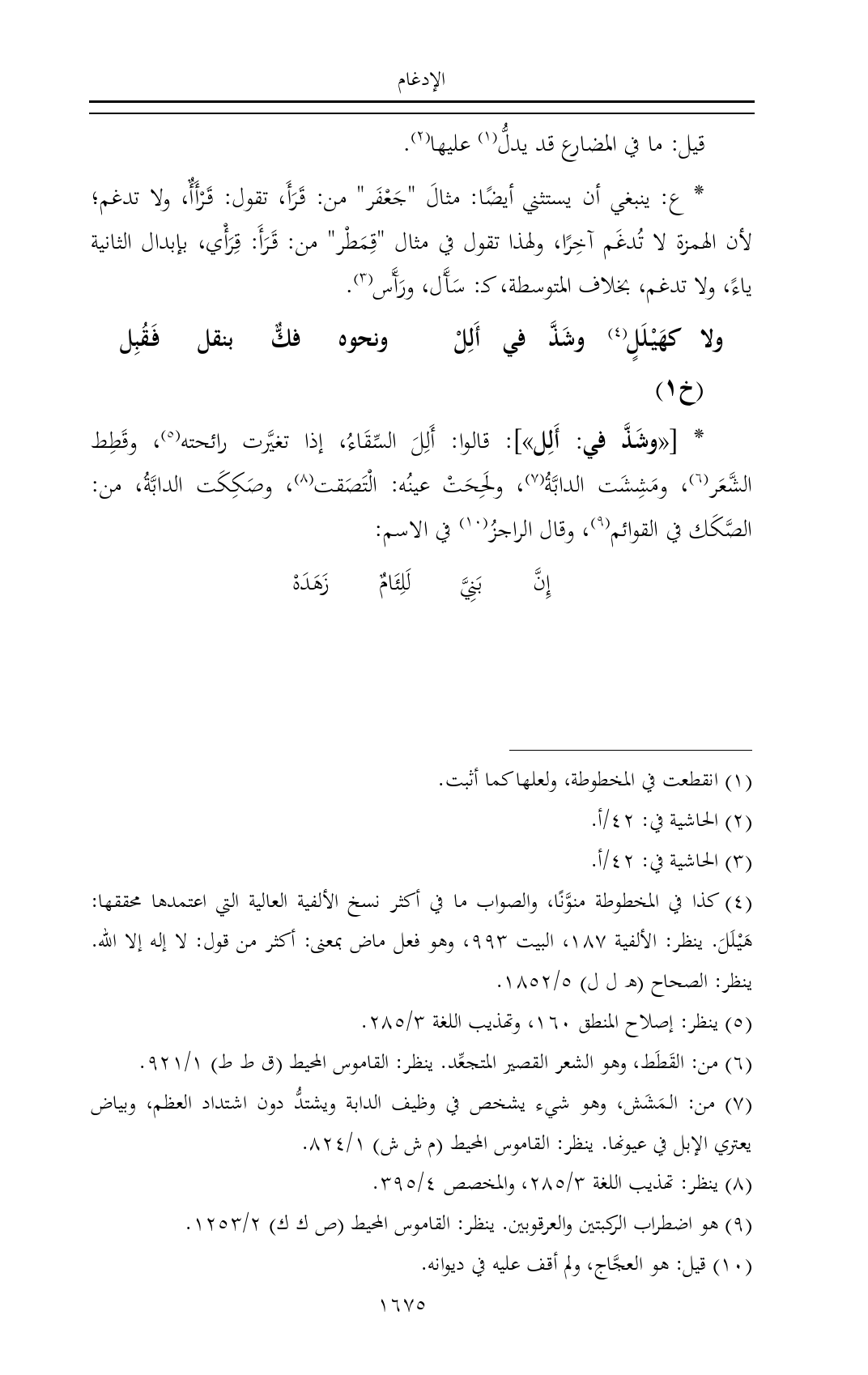 * [«وشَذَّ في: أَلِل»]: قالوا: أَلِلَ السِّقَاءُ، إذا تغيَّرت رائحته (¬٥)، وقَطِط الشَّعَر (¬٦)، ومَشِشَت الدابَّةُ (¬٧)، ولَحِحَتْ عينُه: الْتَصَقت (¬٨)، وصَكِكَت الدابَّةُ، من: الصَّكَك في القوائم (¬٩)، وقال الراجزُ (¬١٠) في الاسم: