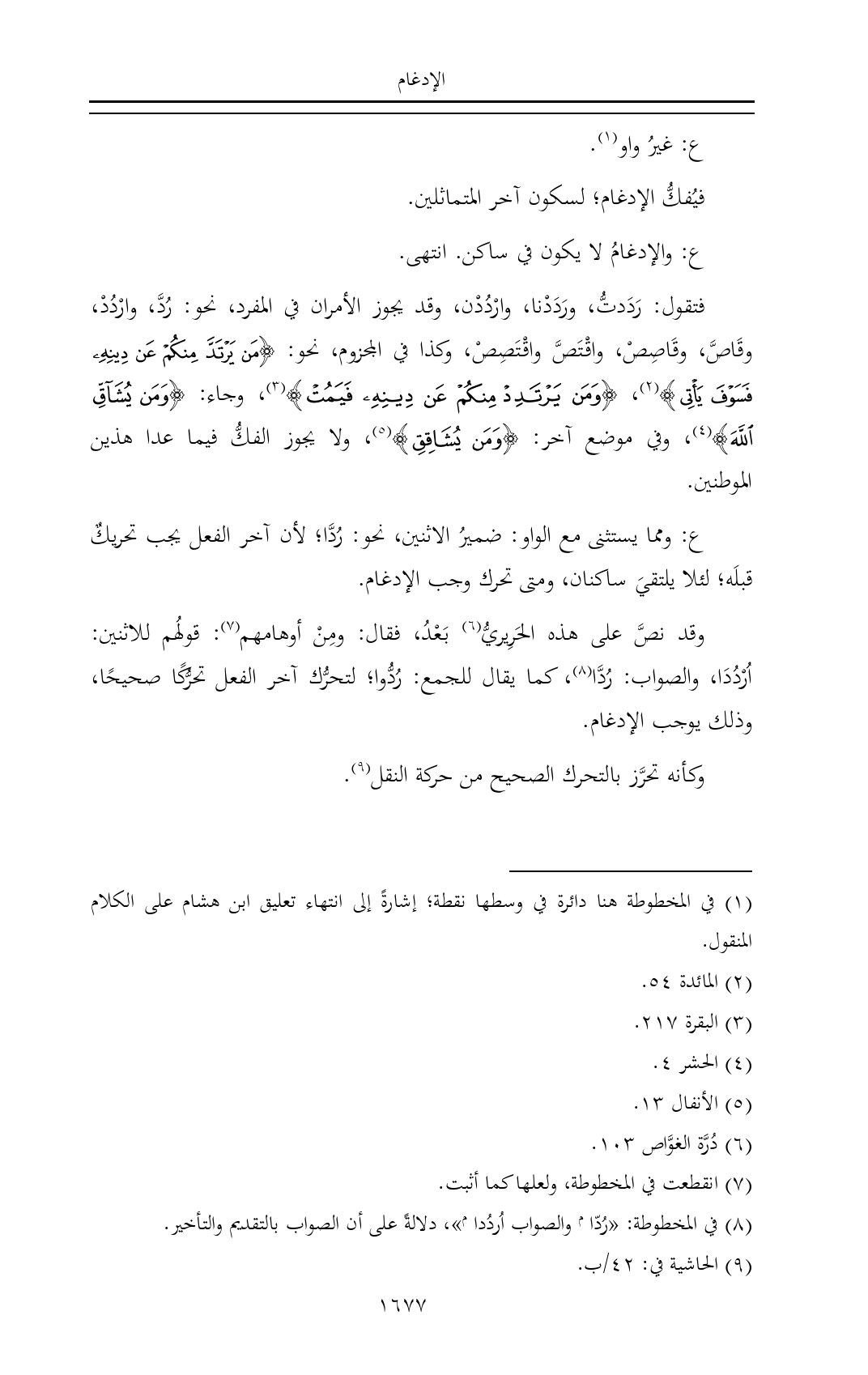 فتقول: رَدَدتُّ، ورَدَدْنا، وارْدُدْن، وقد يجوز الأمران في المفرد، نحو: رُدَّ، وارْدُدْ، وقَاصَّ، وقَاصِصْ، واقْتَصَّ واقْتَصِصْ، وكذا في المجزوم، نحو: {مَنْ يَرْتَدَّ مِنْكُمْ عَنْ دِينِهِ فَسَوْفَ يَأْتِي} (¬٢)، {وَمَنْ يَرْتَدِدْ مِنْكُمْ عَنْ دِينِهِ فَيَمُتْ} (¬٣)، وجاء: {وَمَنْ يُشَاقِّ اللَّهَ} (¬٤)، وفي موضع آخر: {وَمَنْ يُشَاقِقِ} (¬٥)، ولا يجوز الفكُّ فيما عدا هذين الموطنين.