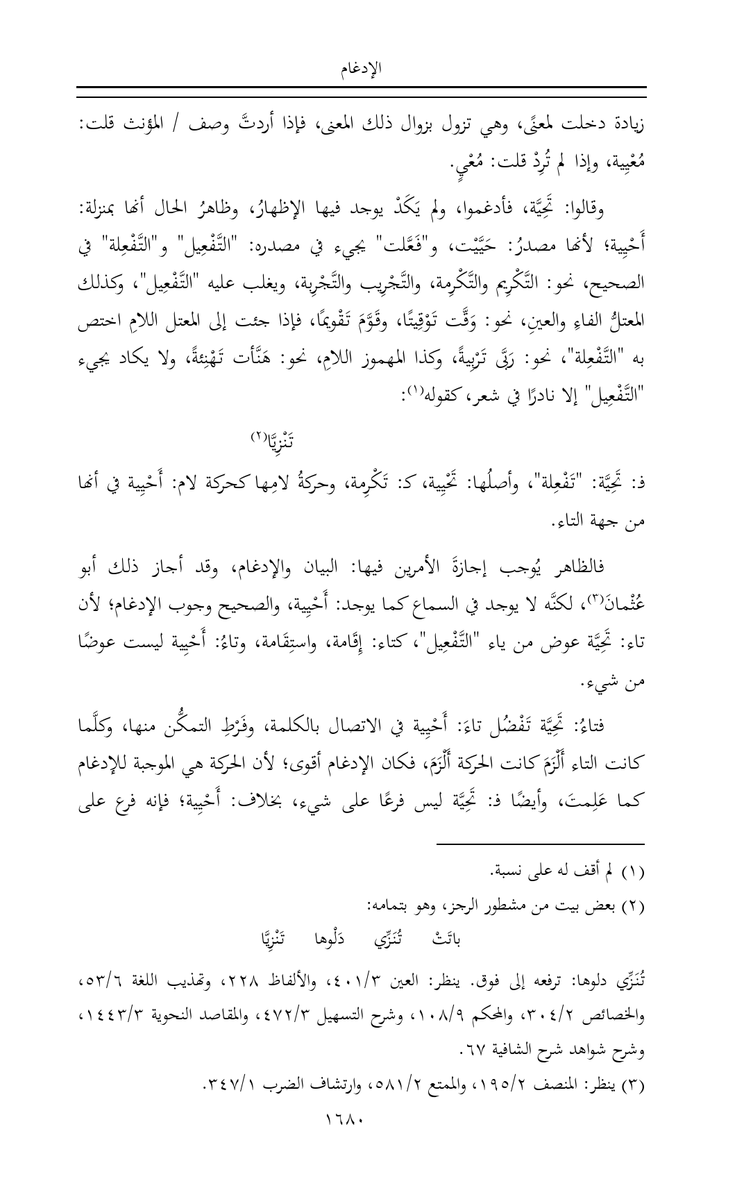 فالظاهر يُوجب إجازةَ الأمرين فيها: البيان والإدغام، وقد أجاز ذلك أبو عُثْمانَ (¬٣)، لكنَّه لا يوجد في السماع كما يوجد: أَحْيِية، والصحيح وجوب الإدغام؛ لأن تاء: تَحِيَّة عوض من ياء "التَّفْعِيل"، كتاء: إِقَامة، واستِقَامة، وتاءُ: أَحْيِية ليست عوضًا من شيء.