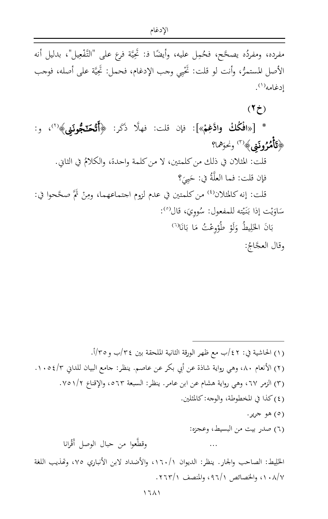 * [«افْكُكْ وادَّغِمْ»]: فإن قلت: فهلَّا ذَكَر: {أَتُحَاجُّونَنِي} (¬٢)، و: {تَأْمُرُونَنِي} (¬٣) ونحوَهما؟