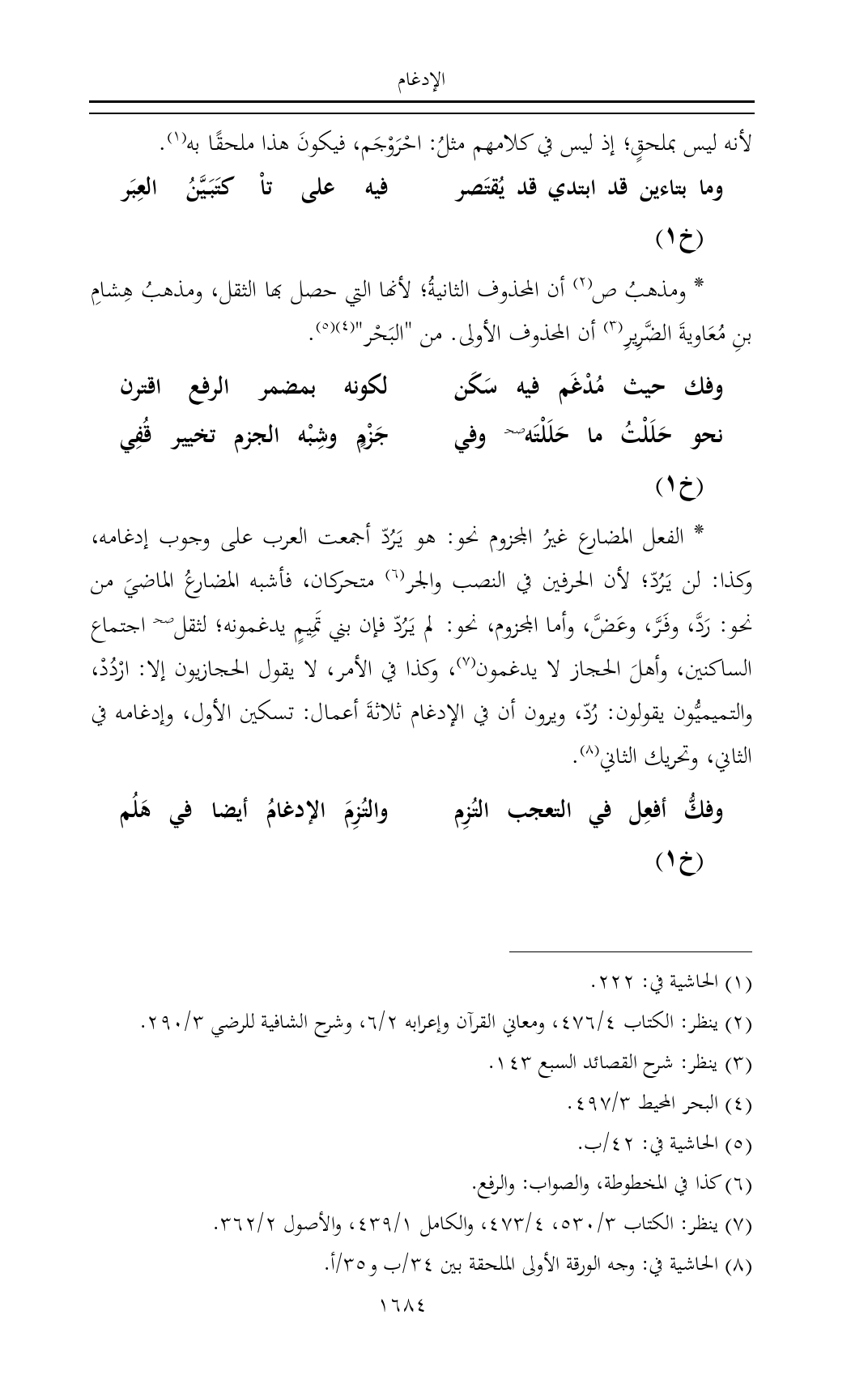 * ومذهبُ ص (¬٢) أن المحذوف الثانيةُ؛ لأنها التي حصل بها الثقل، ومذهبُ هِشامِ بنِ مُعَاويةَ الضَّرِيرِ (¬٣) أن المحذوف الأولى. من "البَحْر" (¬٤) (¬٥).