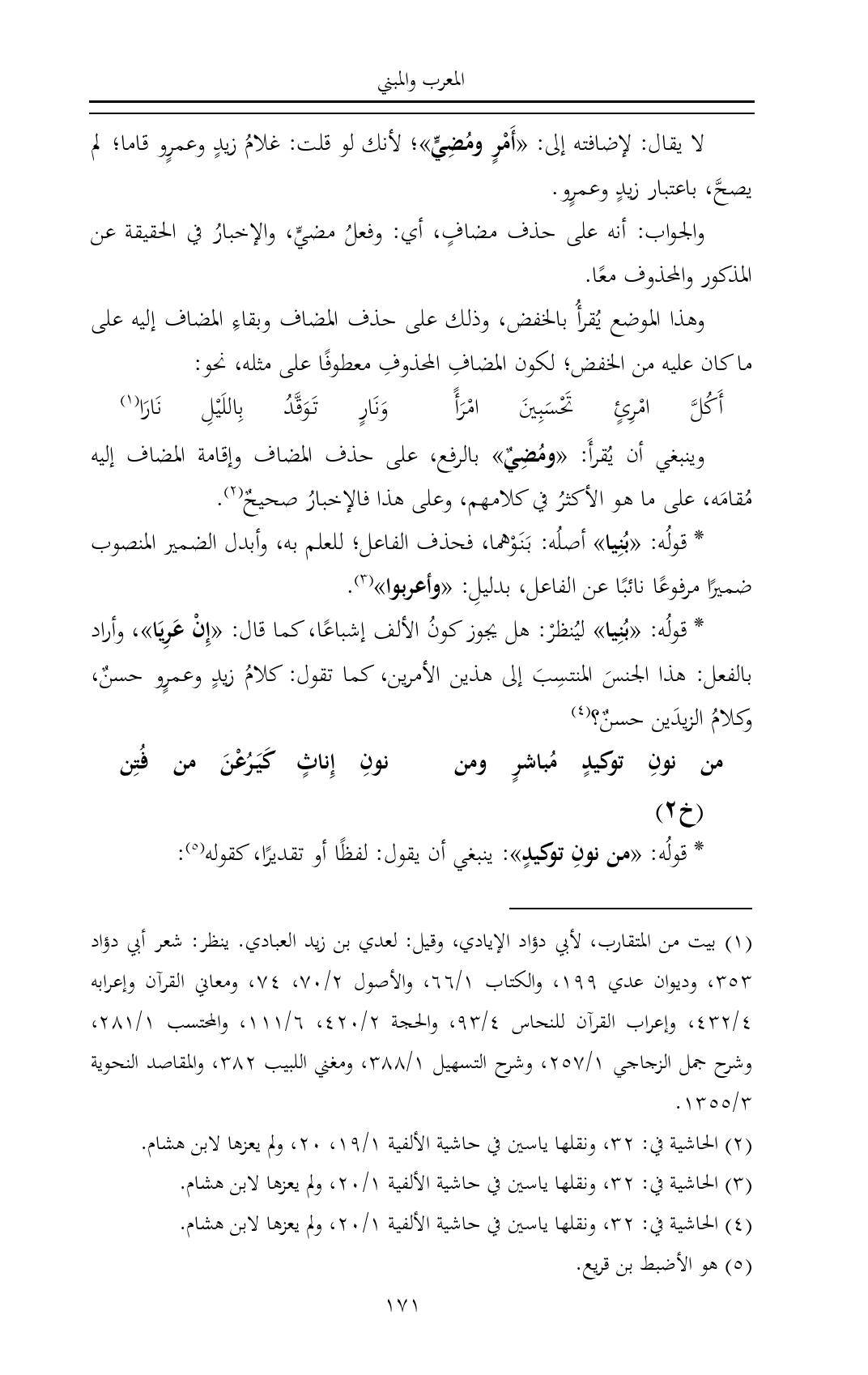 لا يقال: لإضافته إلى: «أَمْرٍ ومُضِيٍّ»؛ لأنك لو قلت: غلامُ زيدٍ وعمرٍو قاما؛ لم يصحَّ، باعتبار زيدٍ وعمرٍو.