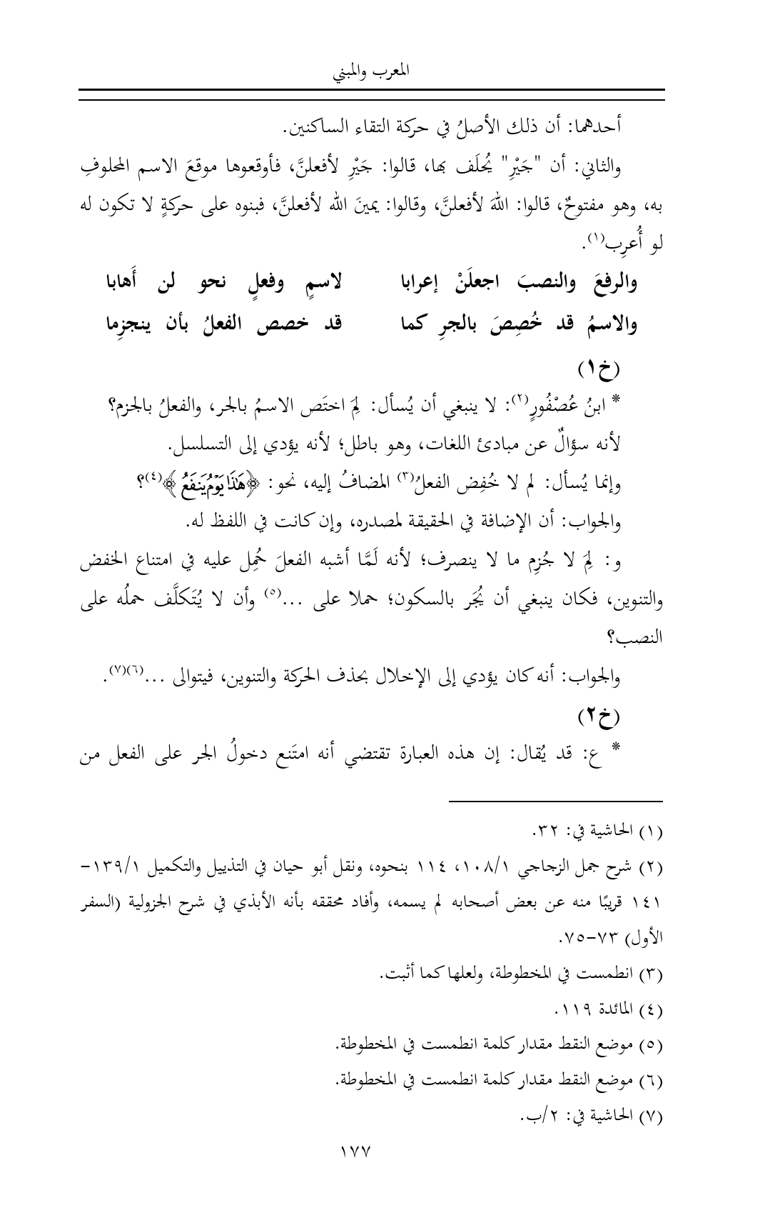 (¬٢) شرح جمل الزجاجي ١/ ١٠٨، ١١٤ بنحوه، ونقل أبو حيان في التذييل والتكميل ١/ ١٣٩ - ١٤١ قريبًا منه عن بعض أصحابه لم يسمه، وأفاد محققه بأنه الأبذي في شرح الجزولية (السفر الأول) ٧٣ - ٧٥.