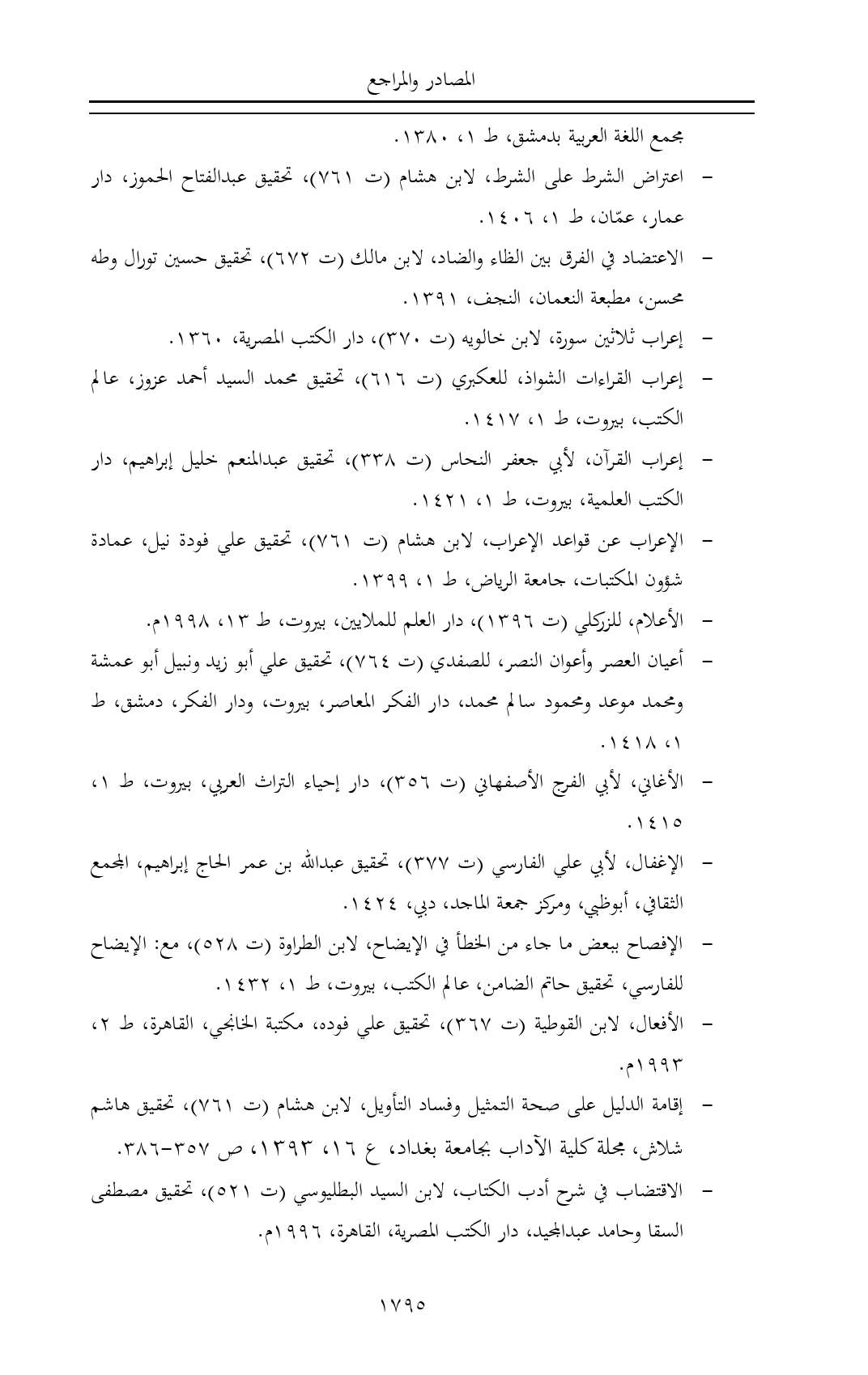 - الإغفال، لأبي علي الفارسي (ت ٣٧٧)، تحقيق عبدالله بن عمر الحاج إبراهيم، المجمع الثقافي، أبوظبي، ومركز جمعة الماجد، دبي، ١٤٢٤.